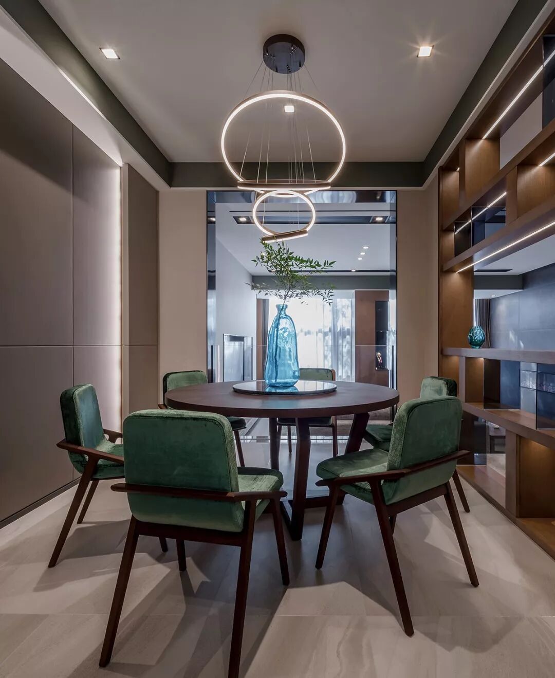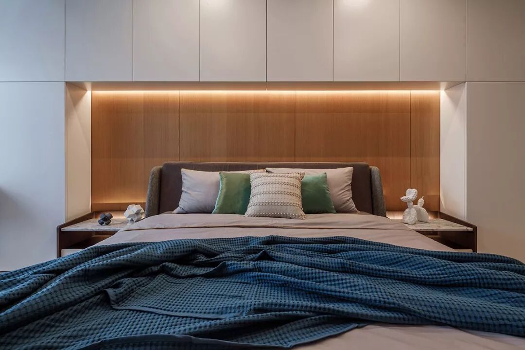 设计师捋以多样的自然材质元素,以优雅的比例与材质色彩变化,坚持在材质选择与细节上的设计品位,以多种蓝色贯穿空间,在丰富多层次的灯光效果下,构建了一个具高质感和舒适感的生活空间,体现了一种“平静的奢华”。