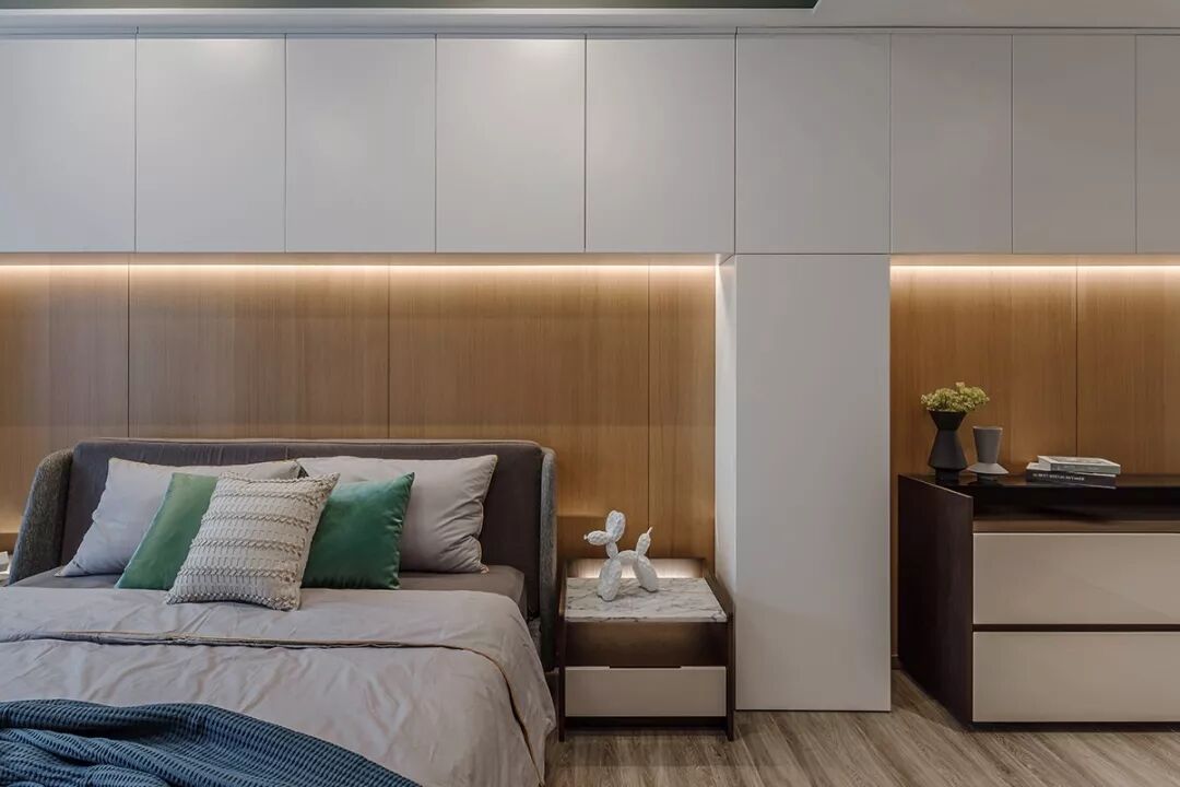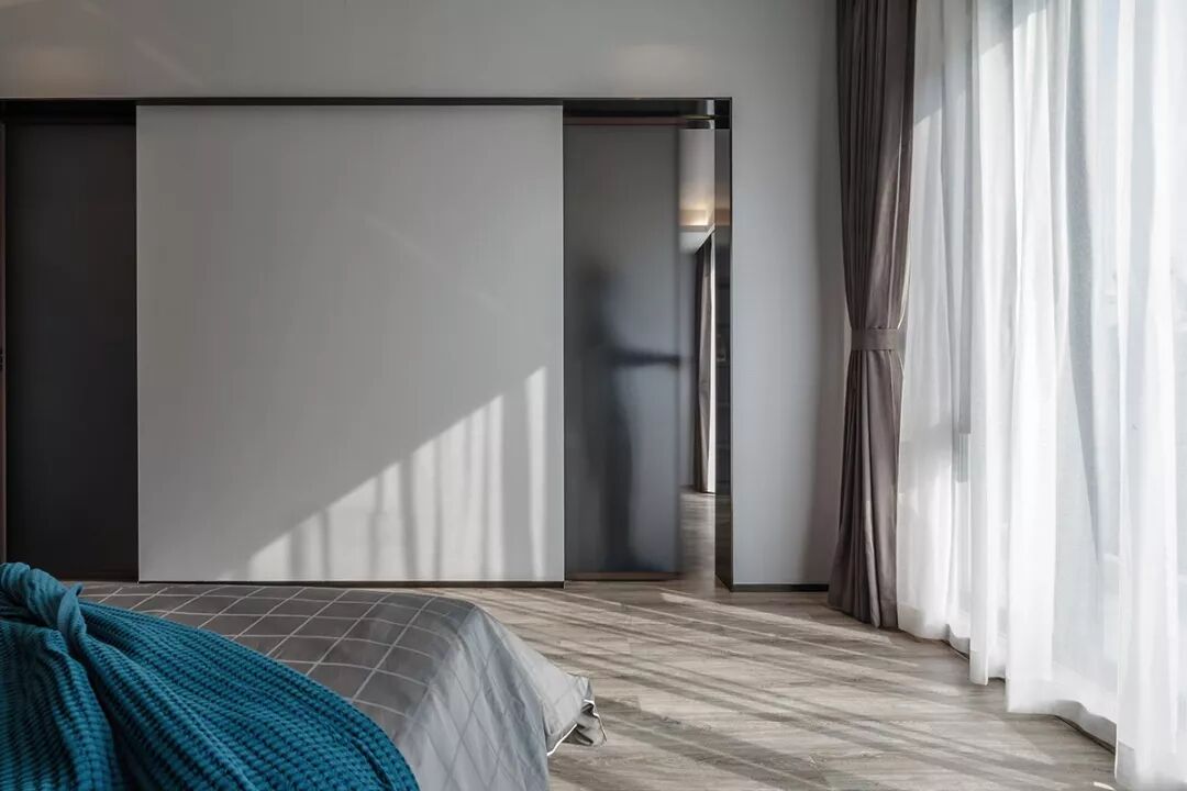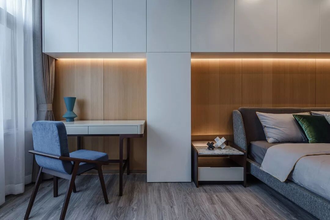 二层的主卧空间,将其原北阳台纳入其中扩大使用空间,同时床头一边有个承重柱,这里设计师用白色的柜体将其包裹,依次将入门的玄关,睡卧的床体,和阅读的书桌依次有序串联起来,形成统一而富有韵律的视觉效果,丰富了储藏又解决了承重柱的美观问题。