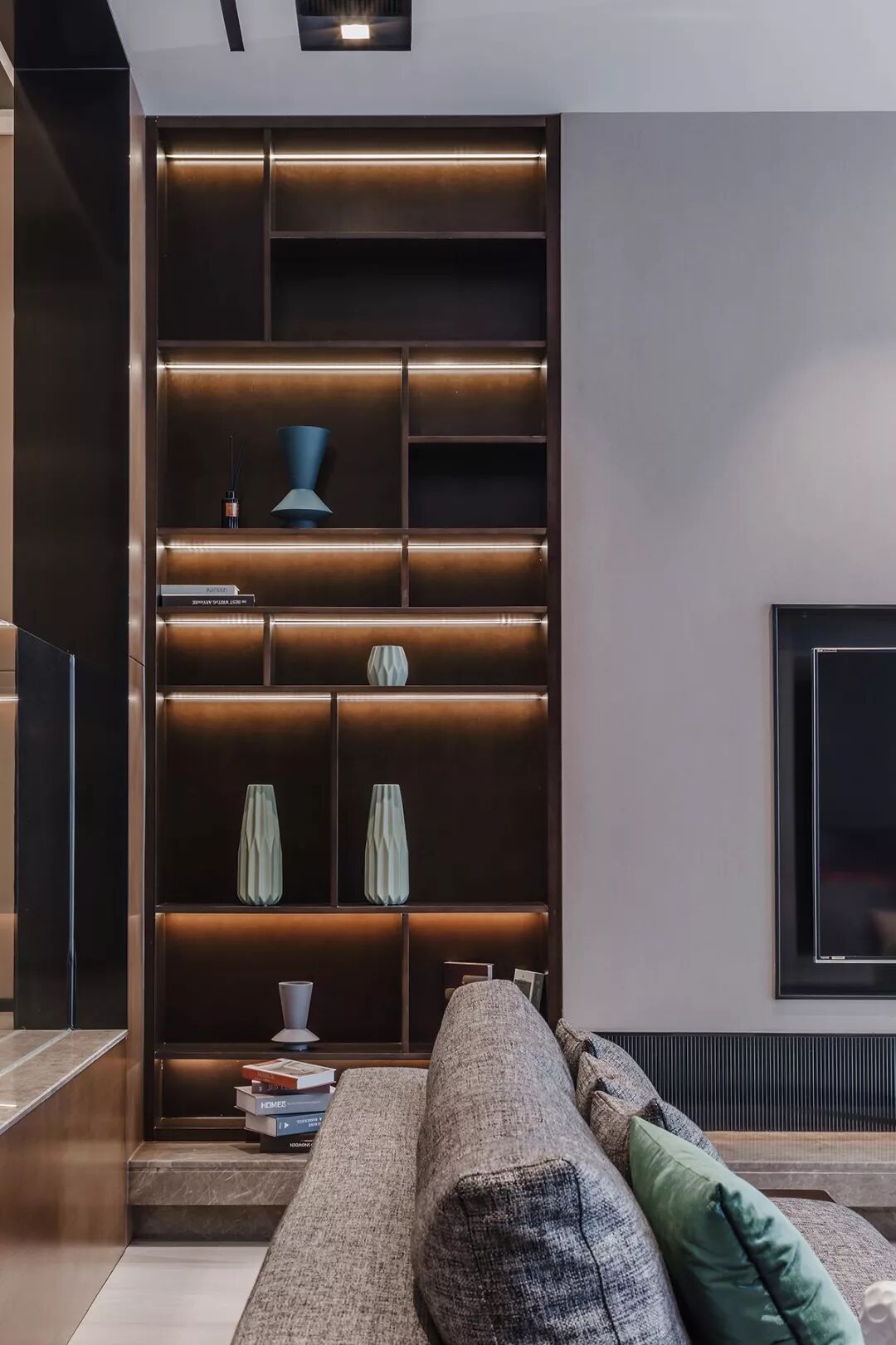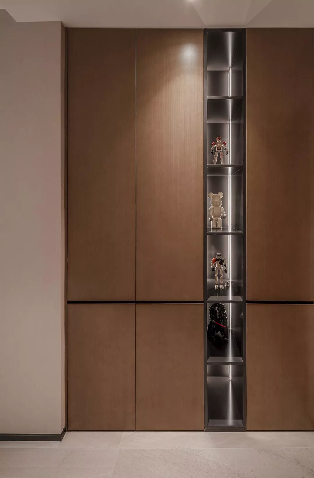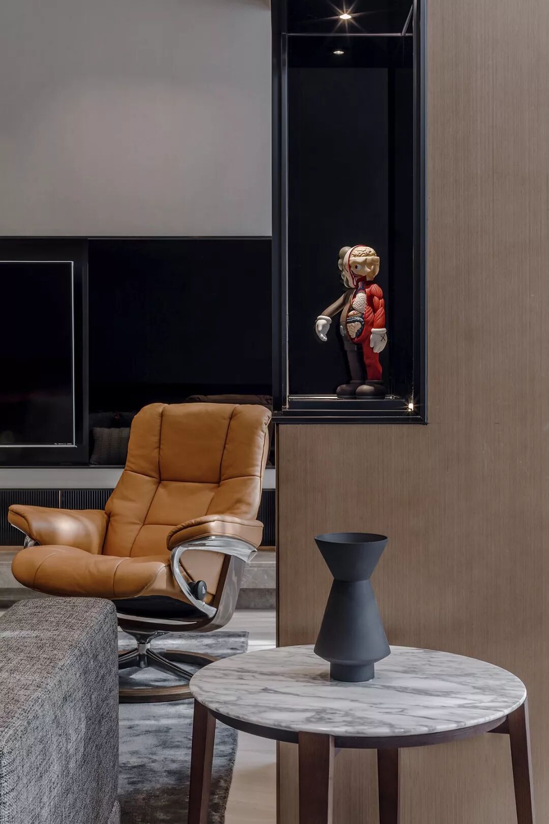 从入户的大门进入空间,入户的鞋帽柜穿插着展示功能的开放搁架,主人的收藏品从一进门的开始就可以展示。右手边卫生间干区的台面悬挑出来,被一面玻璃从中切割,形成独特的穿插美学。左手边的中厨,开放式西厨和餐厅一字排开,在中厨和过道之间,设计师结合原建筑的“L”形柱,用木作和深色玻璃打造了一面展示隔断,在视觉和空间上围合了餐厅区域,使之更具围合的聚合感。沿着过道来到一层的中心客厅,这里的下沉结构设计师将楼梯进行多层次的艺术化处理,使之更具有韵律的雕塑美感,将客厅和阳台打通,获得更为宽敞的视觉和空间效果,但随之而来的一根承重柱则在客厅暴露出来,这里设计师将柱子的形态进行了重新设计,使它具有重点展示功能,KAWS的解剖玩偶放置这里,时尚而新颖。电视墙的设计则依靠了空间的层高优势布置了通高的展示架,在光影交错中演绎了精致而纯粹的美学。