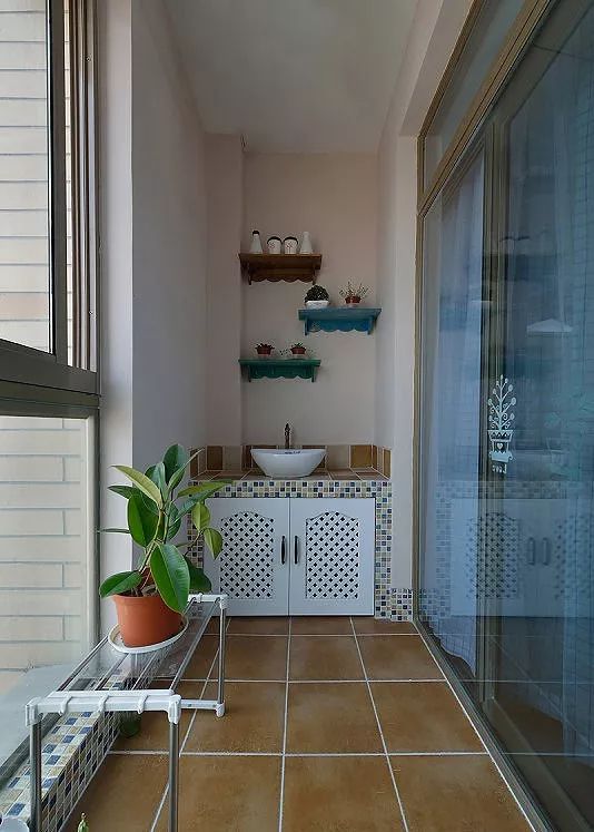 当然,最为简单实用的还是上图这样的设计,想要让阳台变得更好看一些,可以在墙地砖上下功夫,花砖、仿古砖等都是不错的选择。
