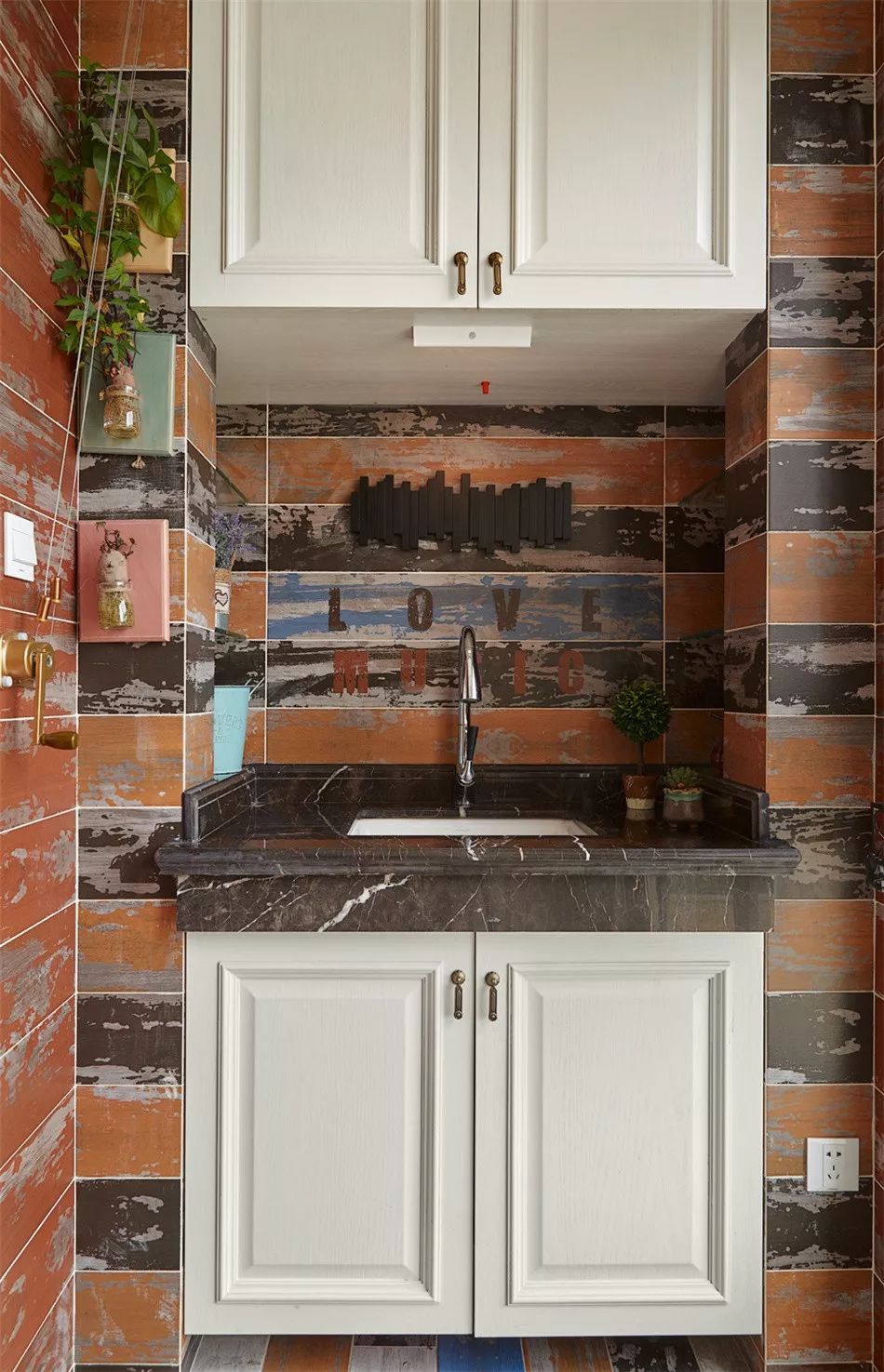 对收纳需求比较多的,就可以考虑整面墙都利用起来做柜子了,留出一个洗手台的空间,方便平时清洗清洁工具和袜子、内衣等。