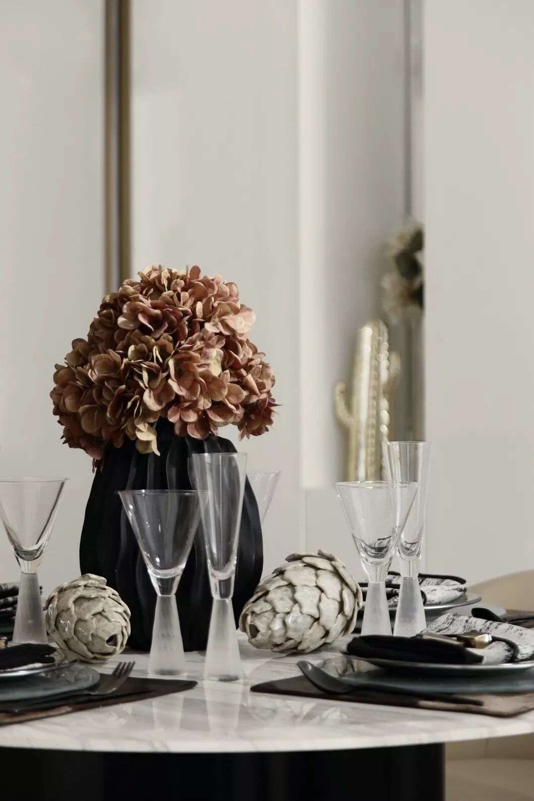 而在陈设上更是延伸了视线,拓宽了空间里的“心机”;角落里金属圆桌以自身冷静的线条,不经意间裸露出原始质感,将多重灰色的层次感呈现得愈加饱满丰富。