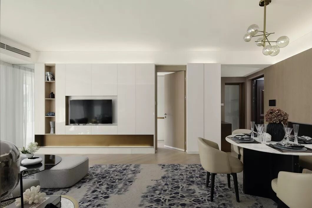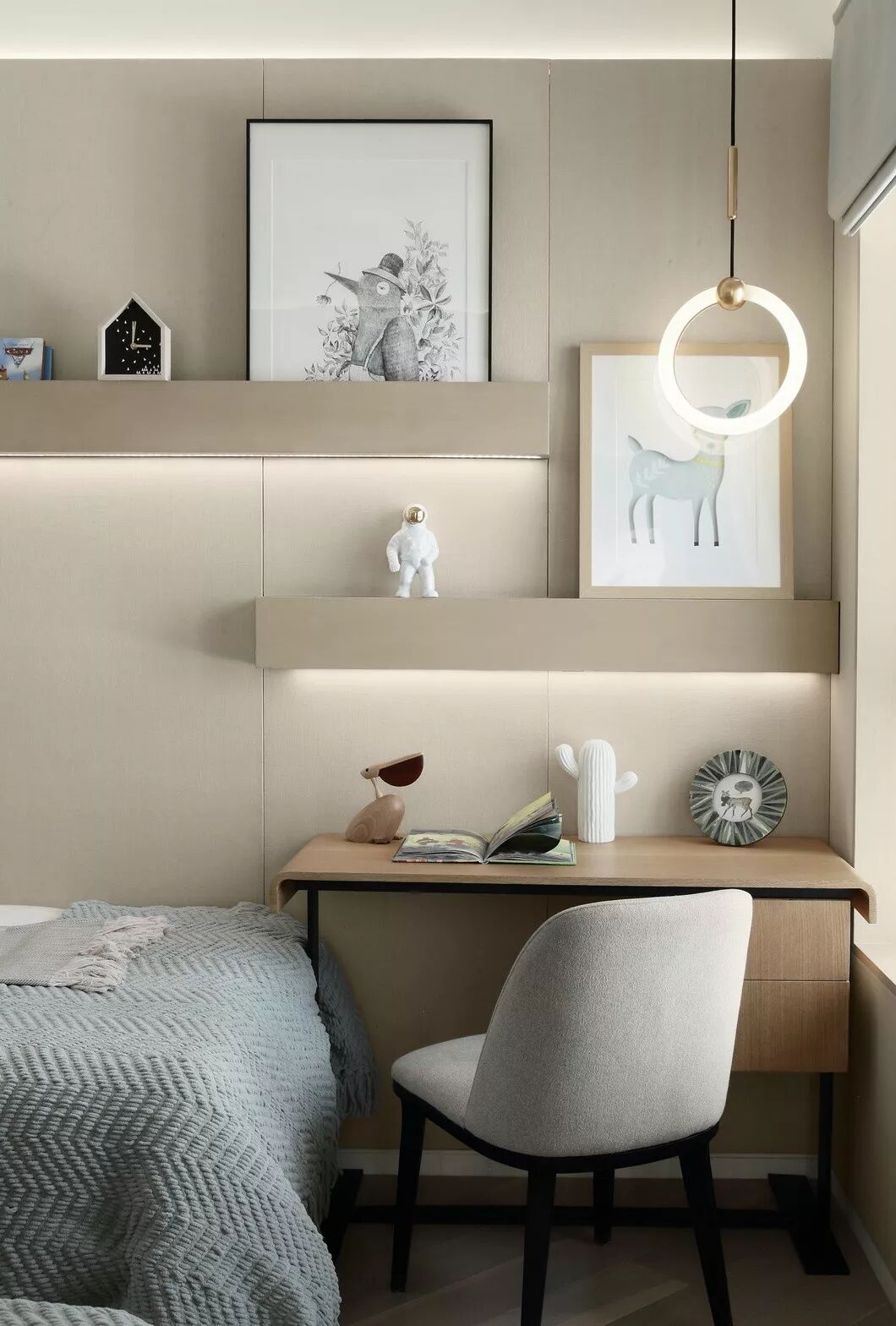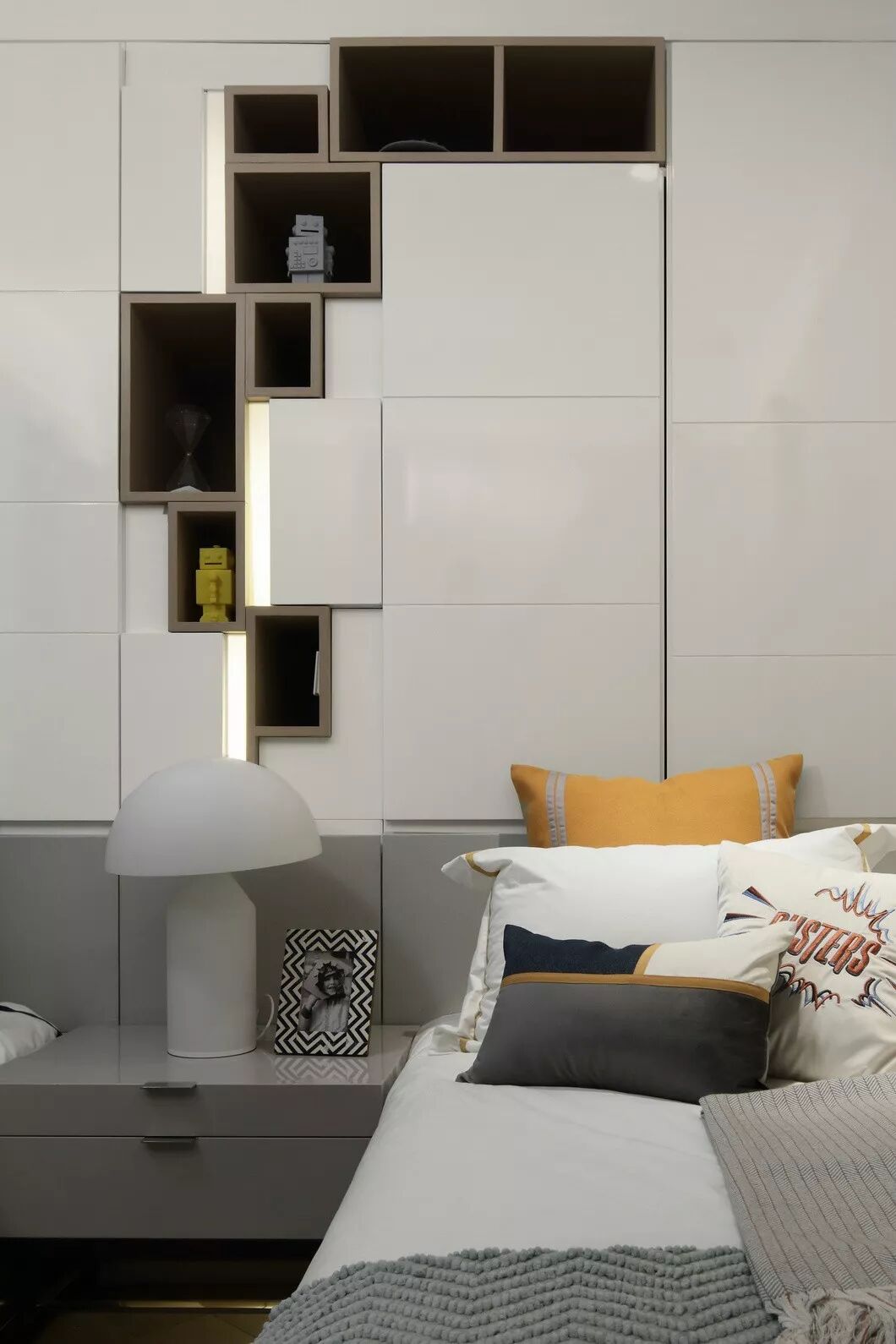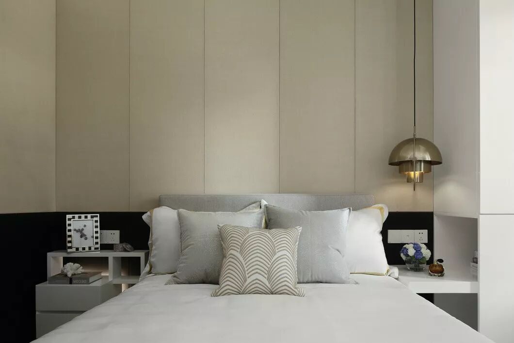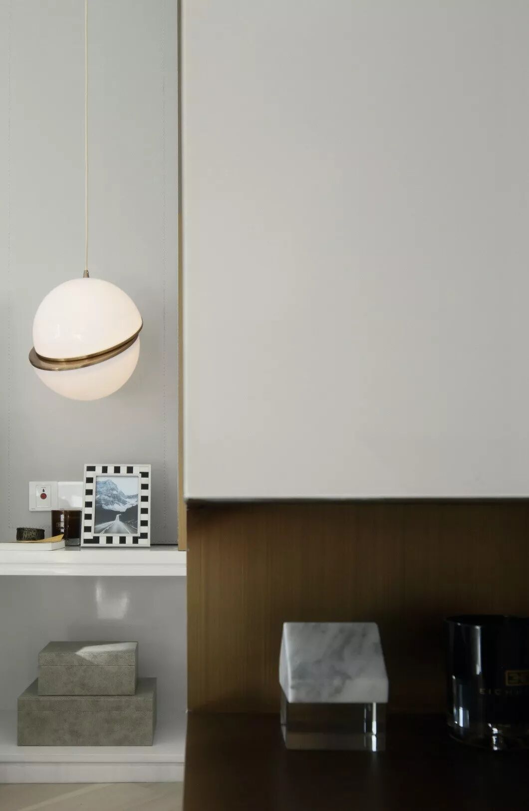 霜灰色墙体在光线下呈现出柔和的肌理,搭配隐约显露的金属光泽,氛围轻松优雅。一对寓意着永恒宇宙体的浑圆吊灯,照亮床头的亲密岁月,直线与圆弧,恰到好处的赋予了空间抽象理性与优雅感性的极简之美。