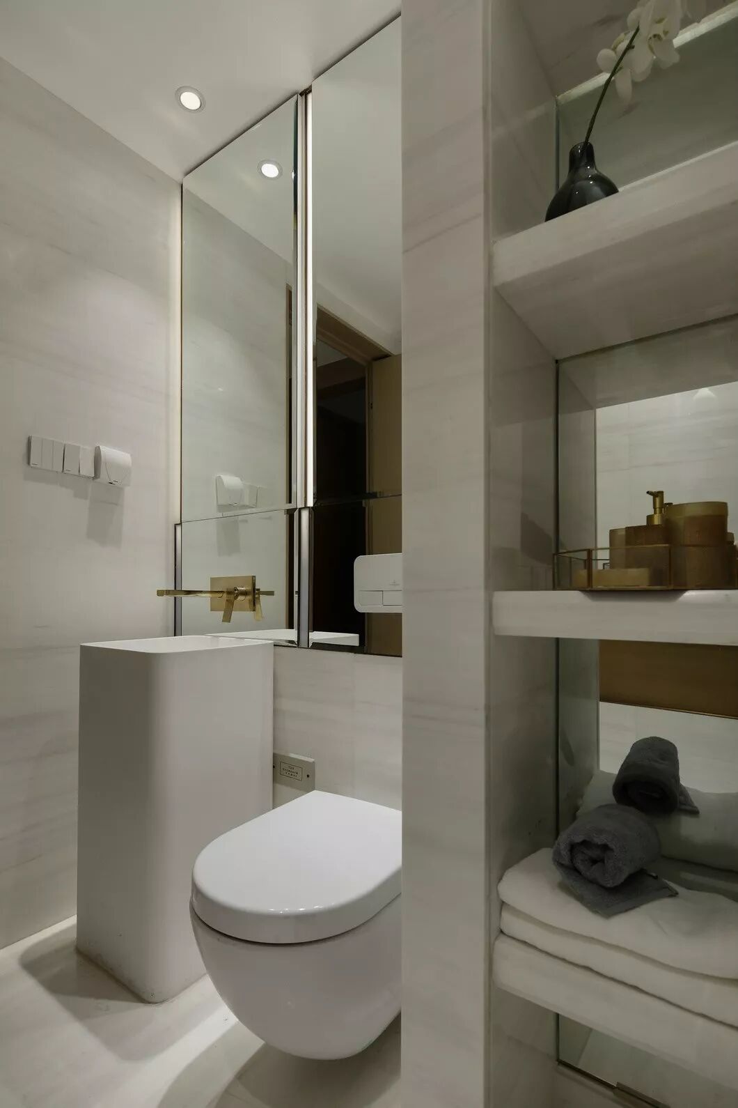 中国人骨子里是内敛的,哪怕是最不起眼的卫浴。素色如河流冲刷过的大理石四壁,隐藏在四方镜之后的储物暗格,配上极简的古铜色龙头点缀,丝丝入扣的阐释了这一空间的功能和性格。