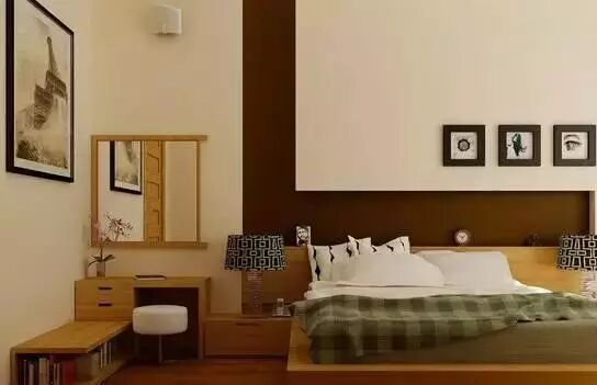 和风一体书架:和风平台床,低矮和外延床廓是一大特色,设计师延展了这种特性,将床头柜、化妆台、卧室书桌、室内矮座等等元素都融入了一个一体的连绵式设计中,效果很棒。