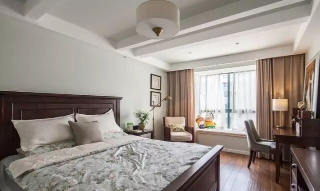 床头墙面里上书架:主人把装置重点放在了床头上,大而隐秘的的整体木质墙面设计,隐藏式的柜门内有存储空间,而开放式的内嵌式搁架上则可以放些装饰品,收纳些时常阅读的书籍。