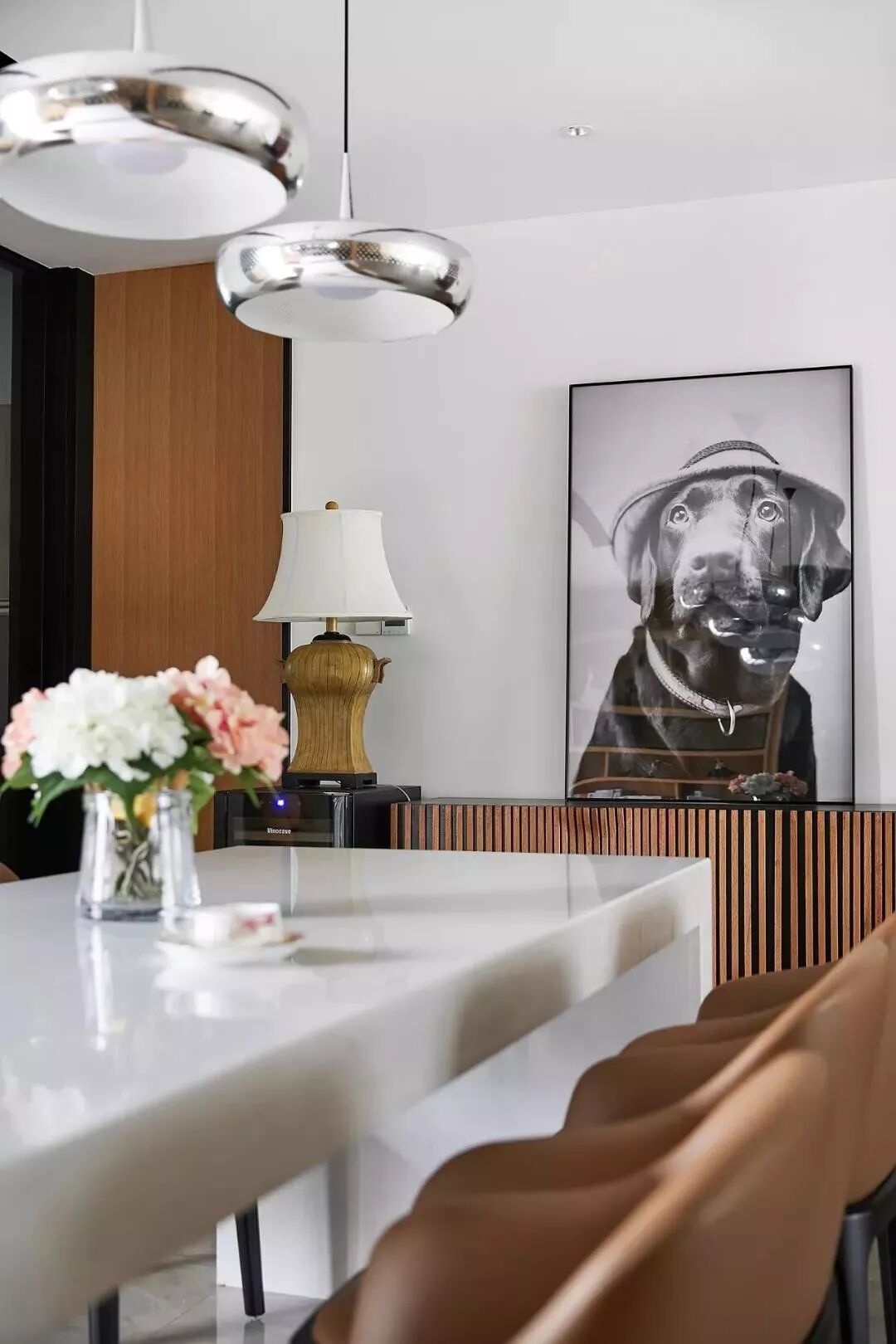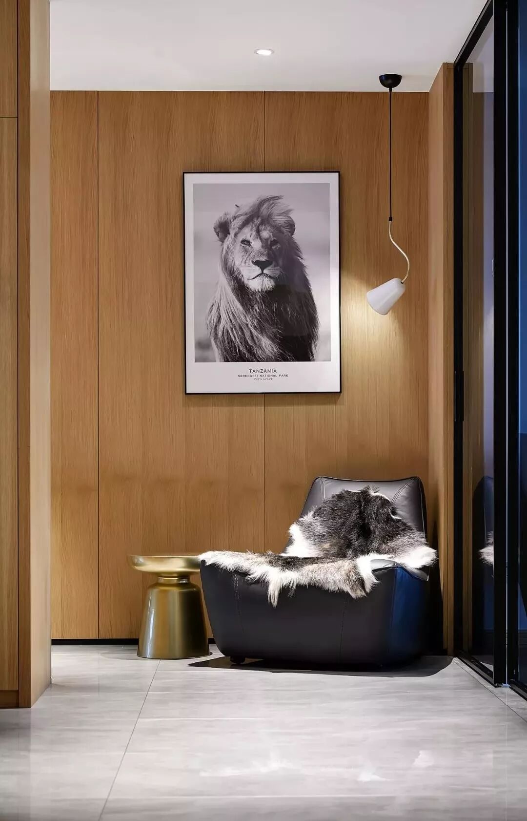 暖色调的皮质家具与灰色调的地砖,加以原木色的木作墙面形成和谐搭配,打造出了一个美学体验与生活温度无间交融的居住空间。