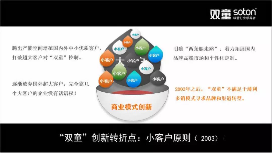 这一切,来源于他对大客户的“恐惧感”。当时双童最大的客户是欧洲一个经销商,一笔订单工厂开足马力也要几个月才能完成。“如果我失去这个订单会怎么样?设备空起来,人挂起来,在这种恐惧感下你能报高价格吗?所以最后都是没钱挣。”