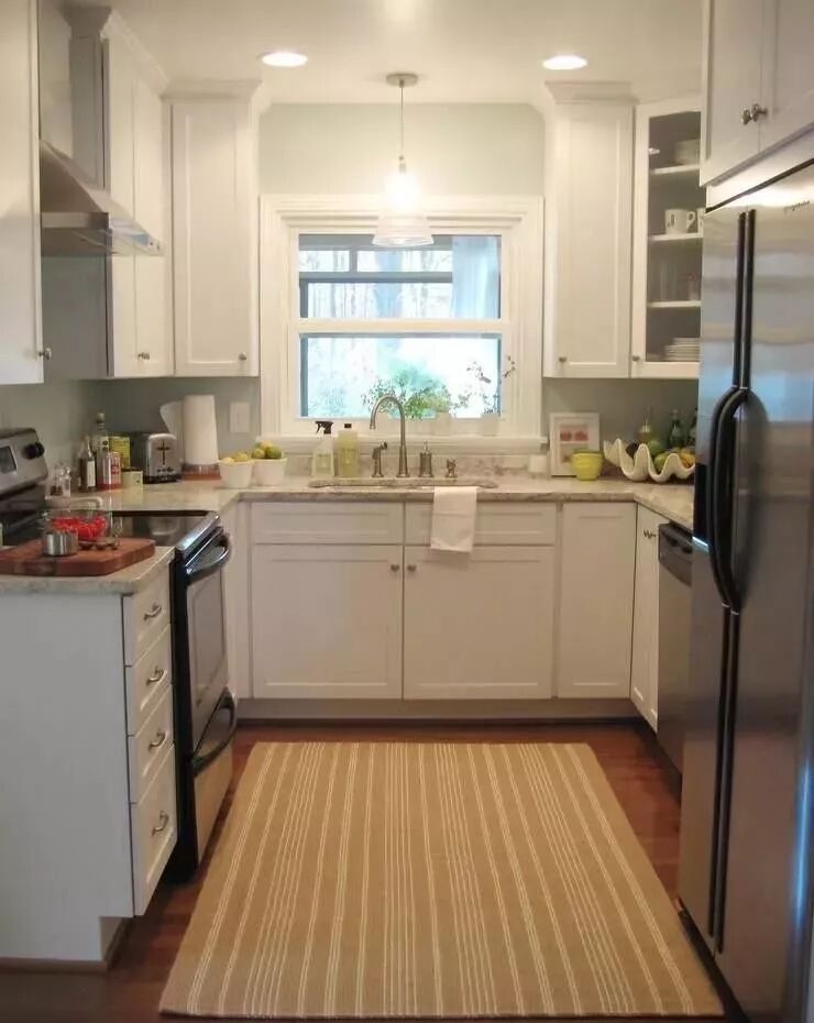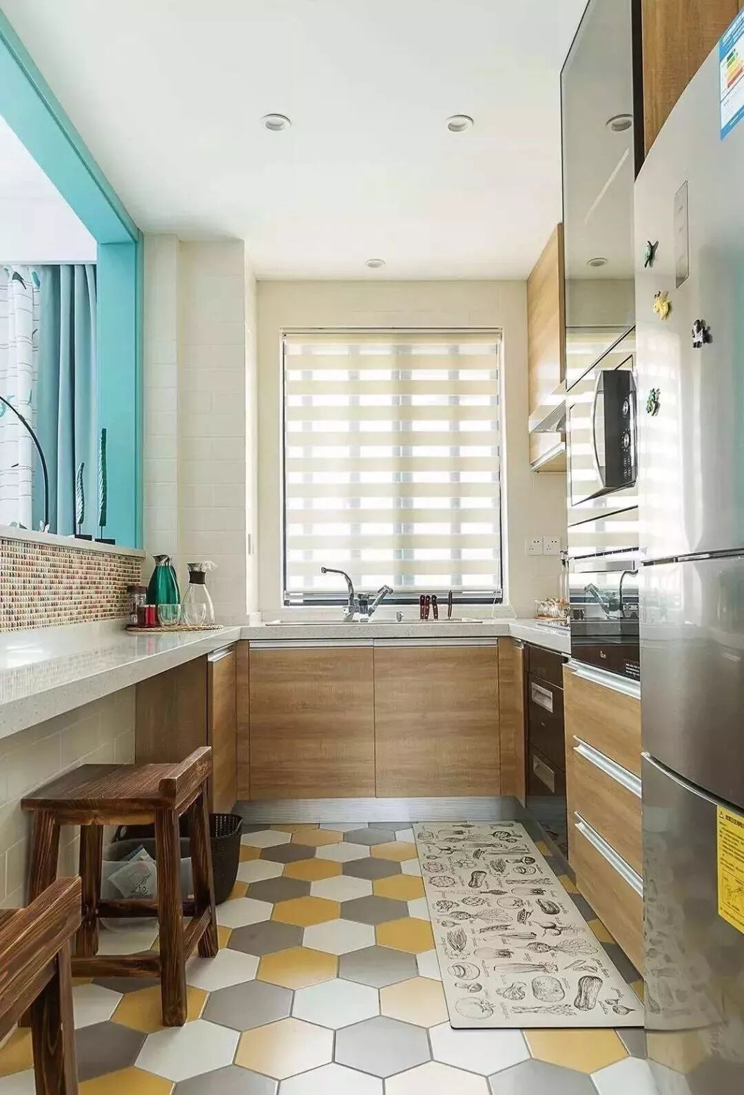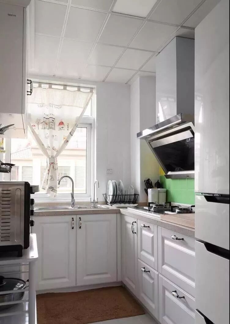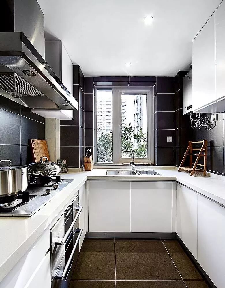 偏于长条形的厨房设计U字型的橱柜,大部分就只能留下一个人通行的空间,对于平常的使用来说,也足够就是。