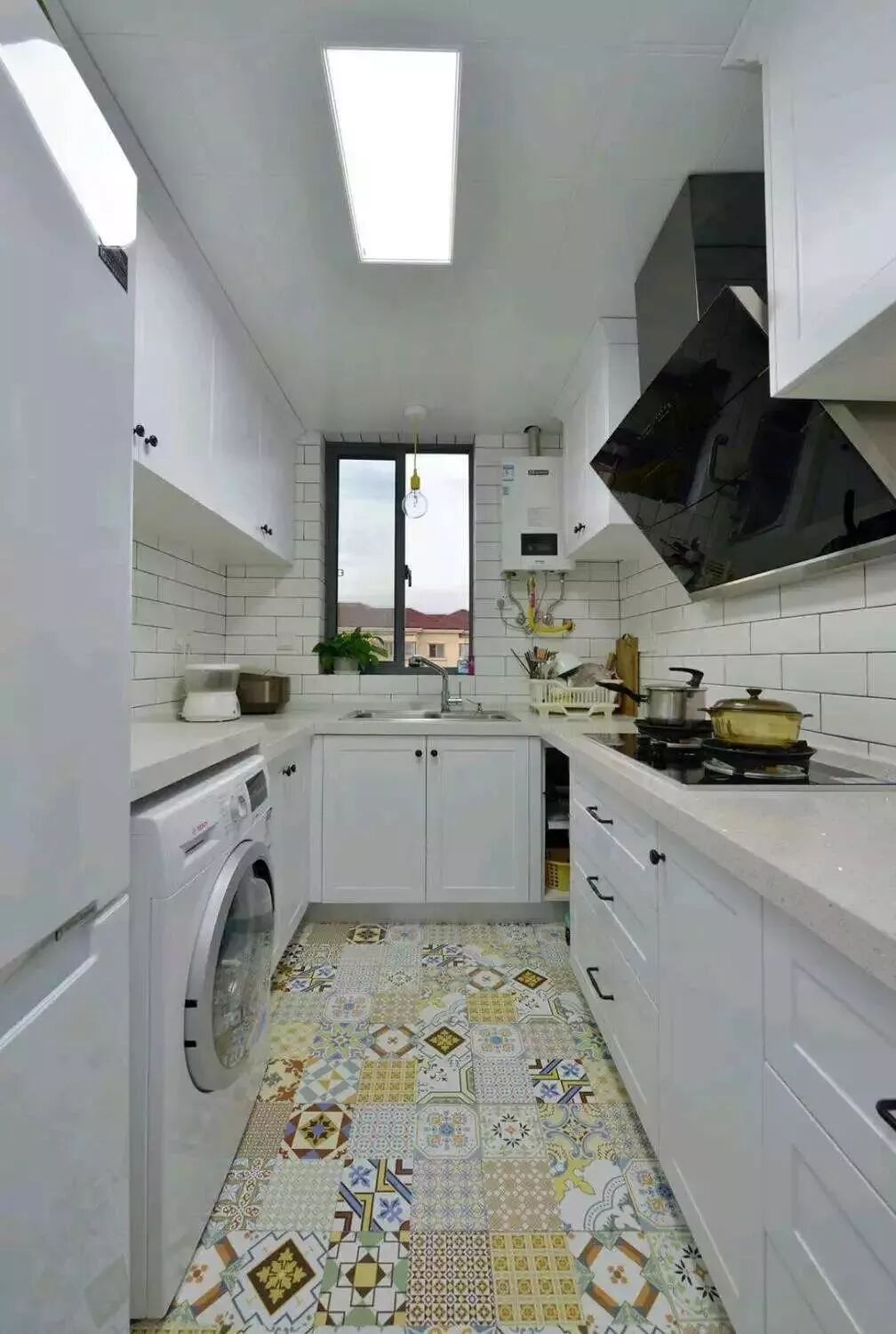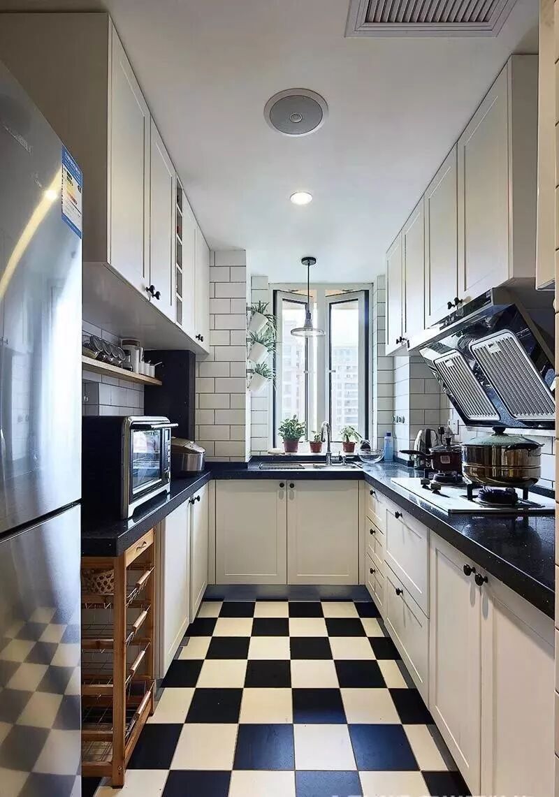 除了布局之外,厨房的颜值也是很重要的,比如你可以用黑白相间的地砖搭配墙面小白砖,让人感觉非常的时尚和有文艺感。