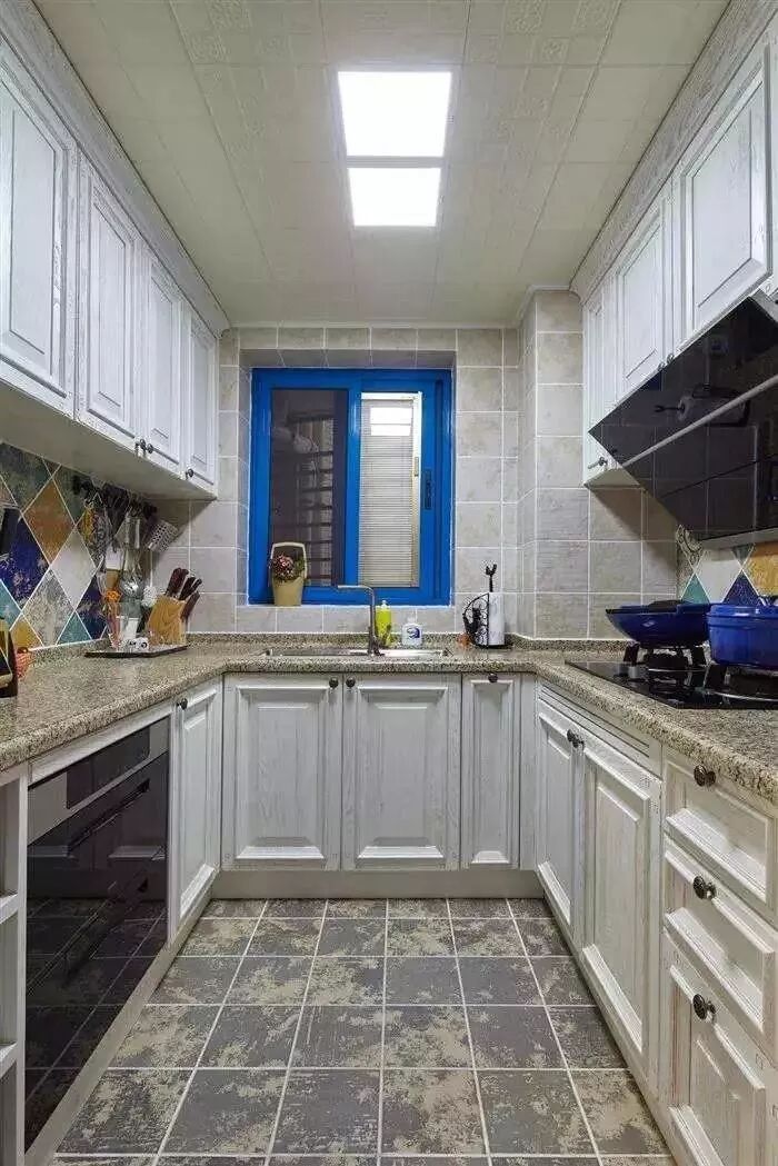 或者给这个厨房搭配一些亮丽的色彩,在灶台、水槽、操作台上方点缀一些仿古砖、彩色砖,让厨房不会看起来太过单调。