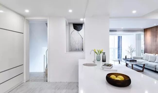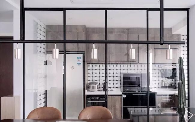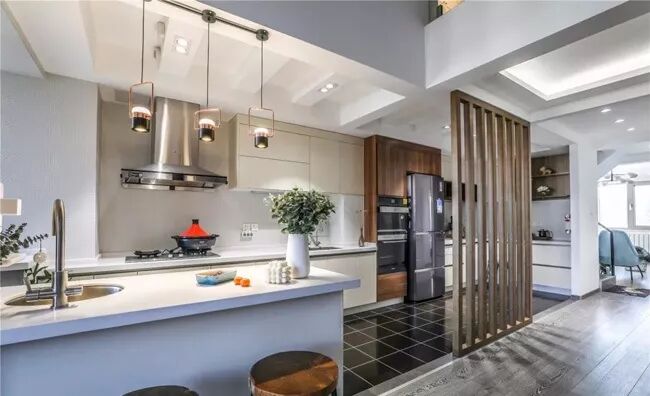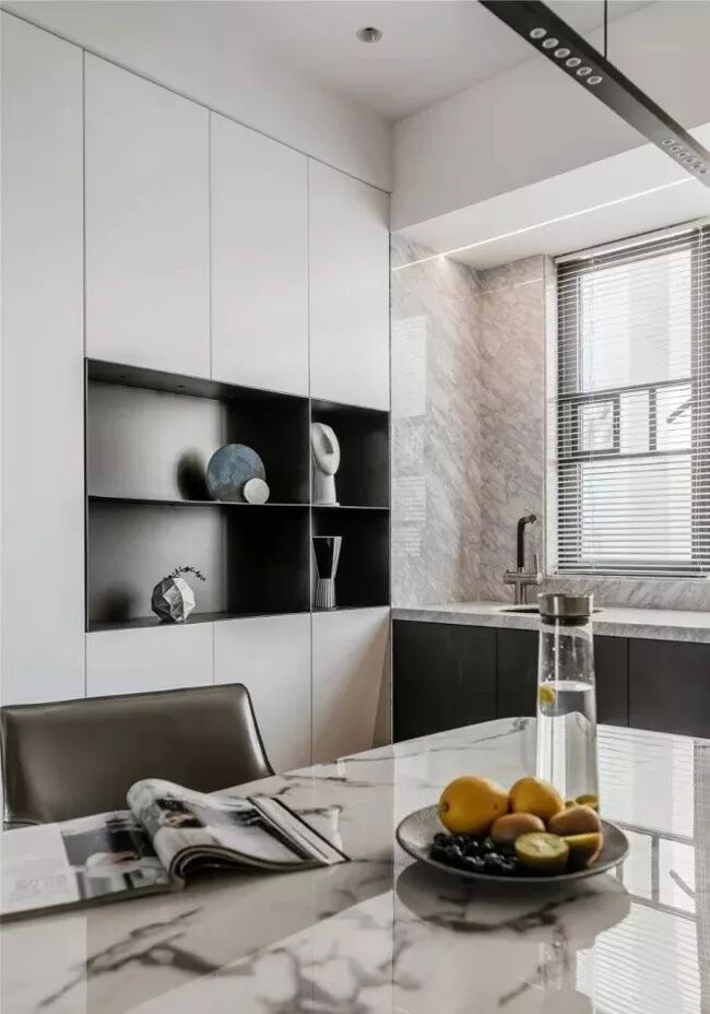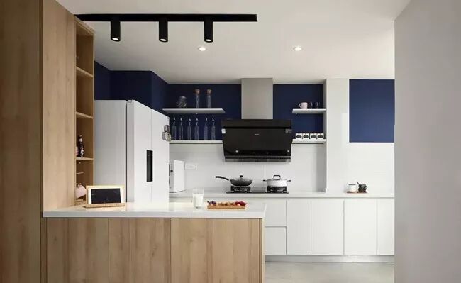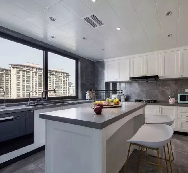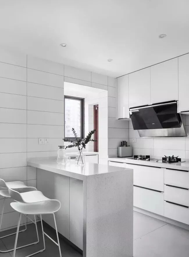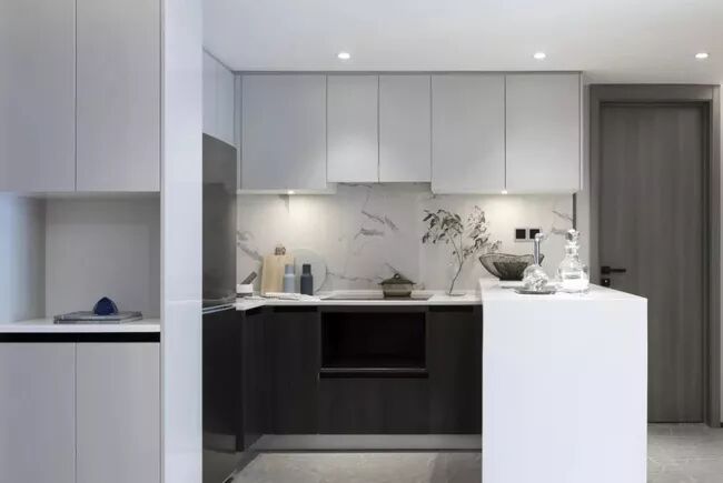 在L型厨房中设置一个简易的小吧台,不仅会让空间瞬间充满小资情调,符合当下对于精致生活的追求。而且可以更合理的利用家里的鸡肋空间,划分出一个新的功能区,在这里可以完成传菜、吃饭等日常活动,分担了厨房的部分功能。