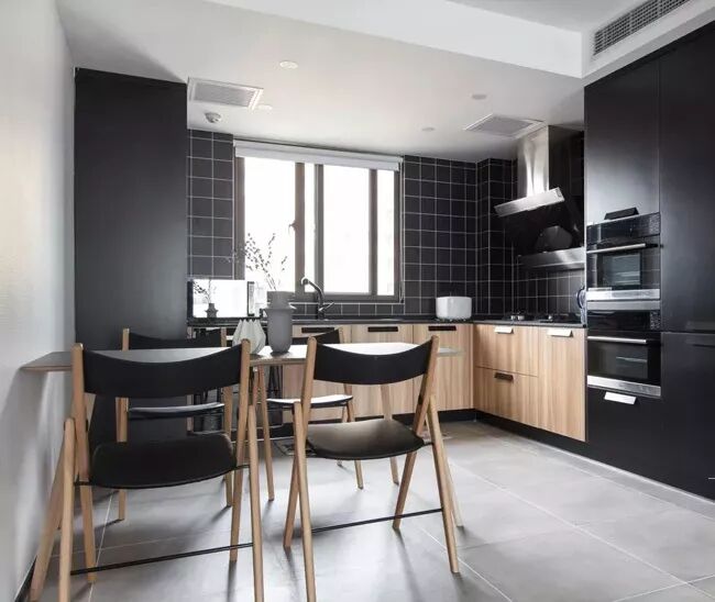 在L型厨房中设置早餐桌,可以将空余位置有效的利用起来,同时也可以分担厨房功能的部分压力,这和小吧台异曲同工,但是餐桌更加灵活,可以根据实际剩余面积和居者使用情况而变化,面对于成长型家庭,家庭成员与结构很可能产生较大变化,这样的设计更具有可延伸性。