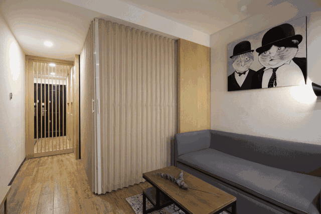 扩大门洞,但不用推拉门,改用折叠门,门推到两边,基本不占用空间,和把门推到墙洞中效果差不多。