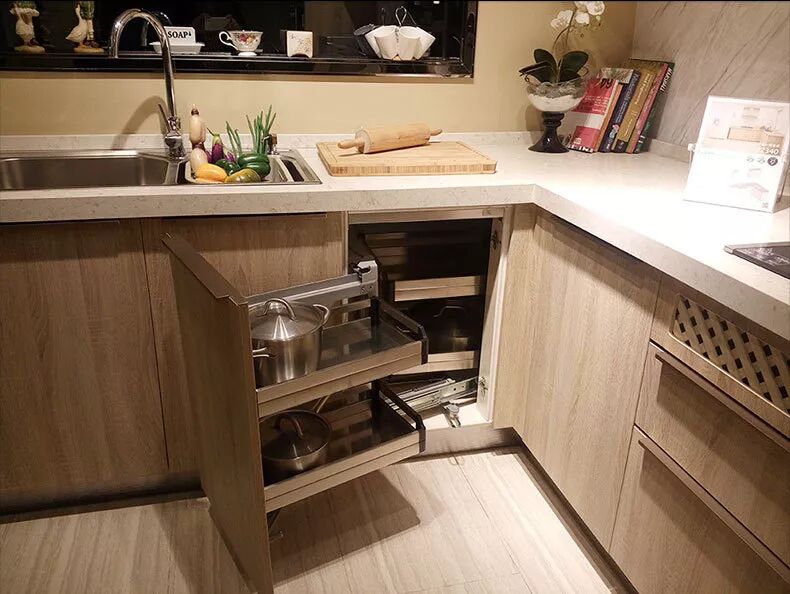 由于小户型厨房的空间很小,如果面宽较窄,则不宜选择那些带拐角的橱柜,可能会使空间显得更小,但如果面宽较宽,则要充分利用拐角的空间,让拐角处的空间充分利用,比如使用转篮可摆放更多的锅碗瓢盆。