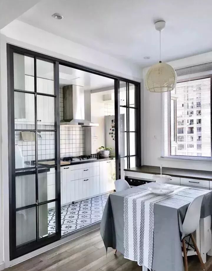 扩大门洞,将一扇门变为两扇推拉门,最好是玻璃的,关上门厨房也通透,打开门就是个半开放式厨房,或是两面墙壁都装成玻璃门,视觉上更开放。