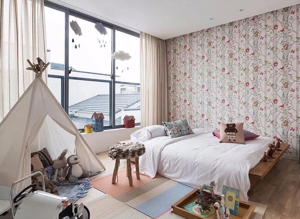 受成长环境的影响,所以在儿童房的环境营造和氛围烘托上,需注意保护孩子的想象力和创造力,来协助引导孩子的成长。