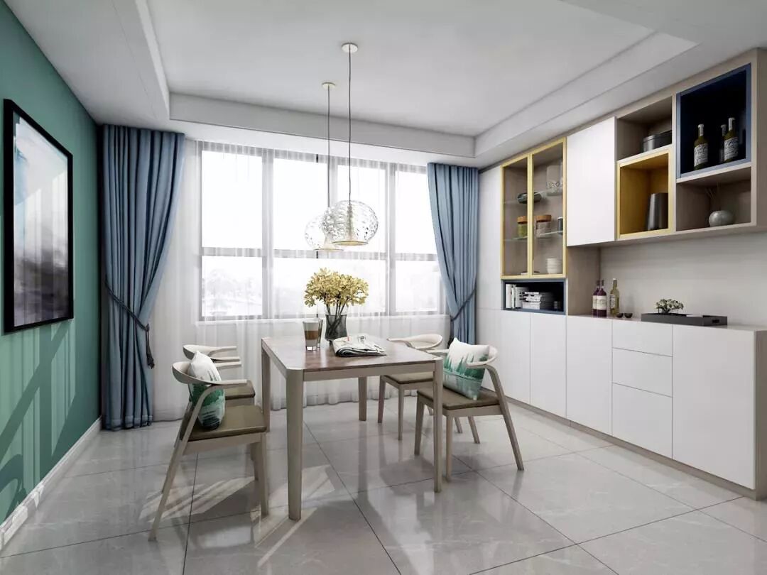 ▲一面复古绿的墙,是一个抢镜的地方。是你在家拍照打卡刷朋友圈的很好背景。整体来说,客餐厅元素统一,在细节上又有微末不同,处处透漏着小惊喜。