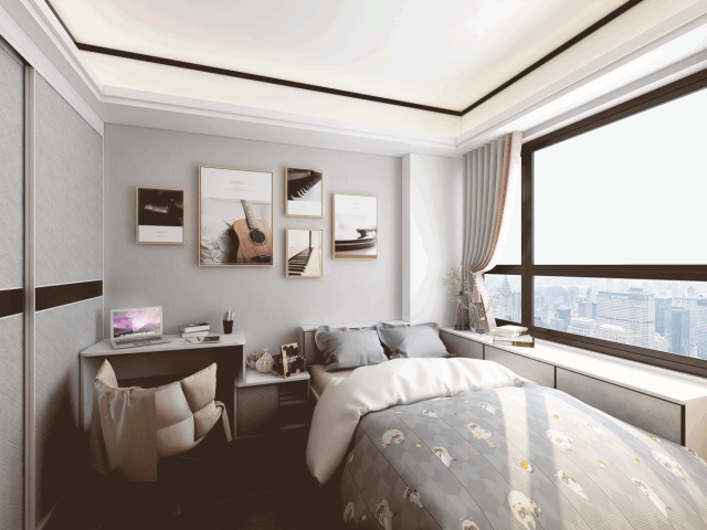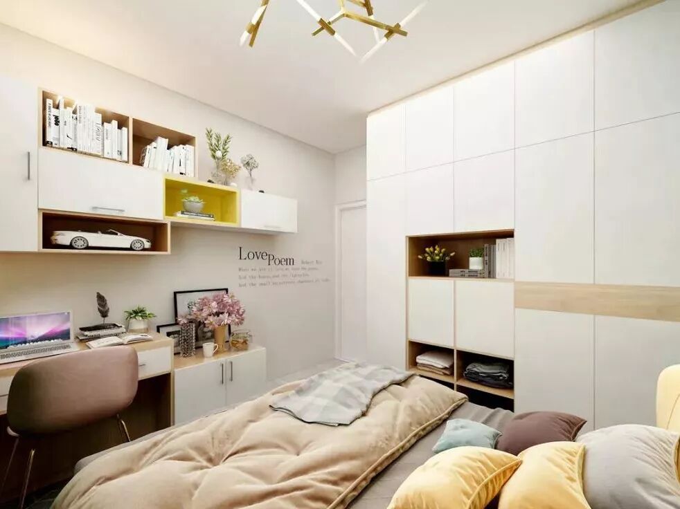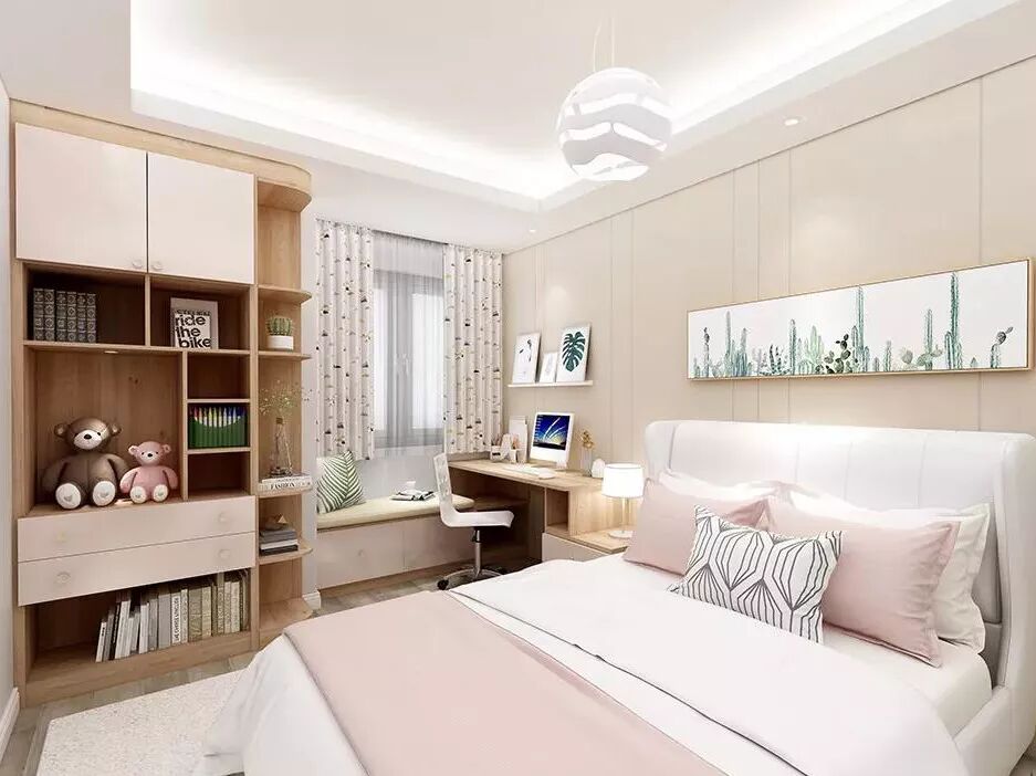 如果你在儿童房中使用榻榻米+书桌柜的设计,自然比单独的床+书桌+柜子更省空间。