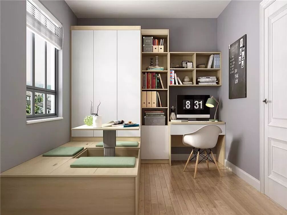 榻榻米边缘也可延伸为书桌,头尾部也可加装衣柜、收纳柜等。