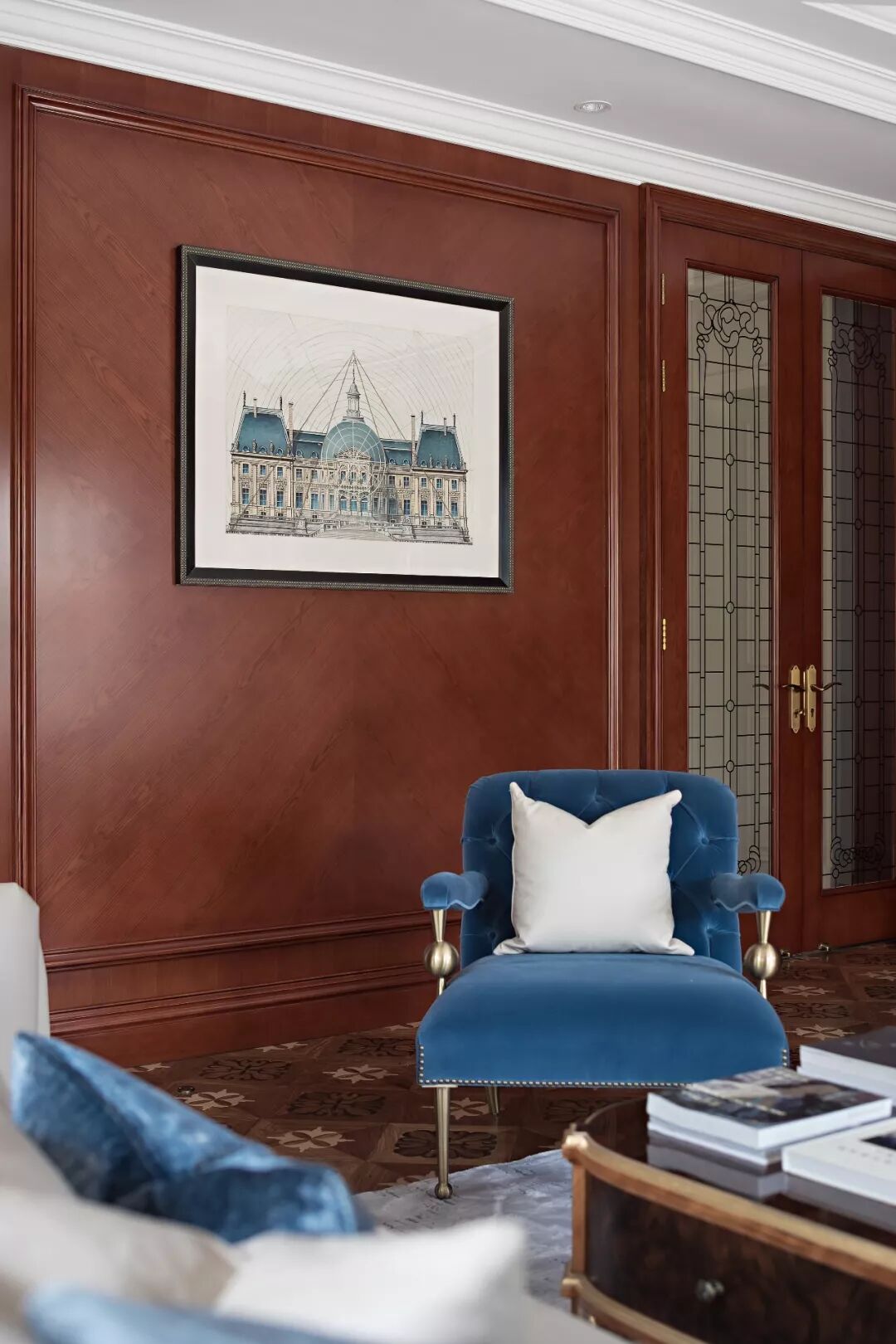 茶几旁一把引人注目的单人沙发,用克制而又浓烈的蓝与金来向绅士精神致敬,海军蓝色缓缓释放低奢的尊贵之感,与天鹅绒安静绽放的优雅气质不谋而合,又与客厅的主色调遥相呼应。