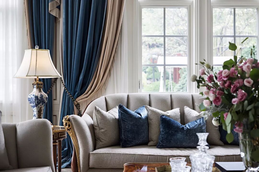 蓝色系窗帘优雅曼妙的线条刚好彰显了柔美的垂坠质感,冷暖两色的对比,力度均衡,这种低调仍不失贵气的搭配方式,利落而大方,经典且耐看,给人带来雅致稳重的感受。