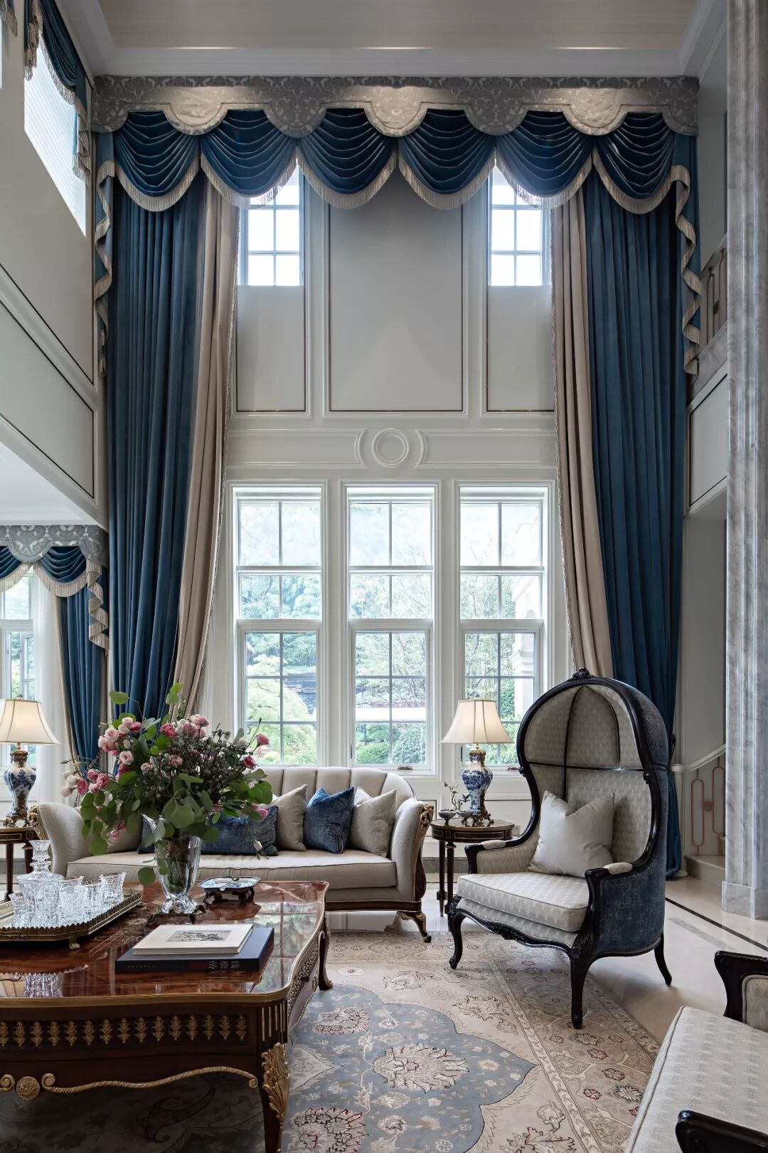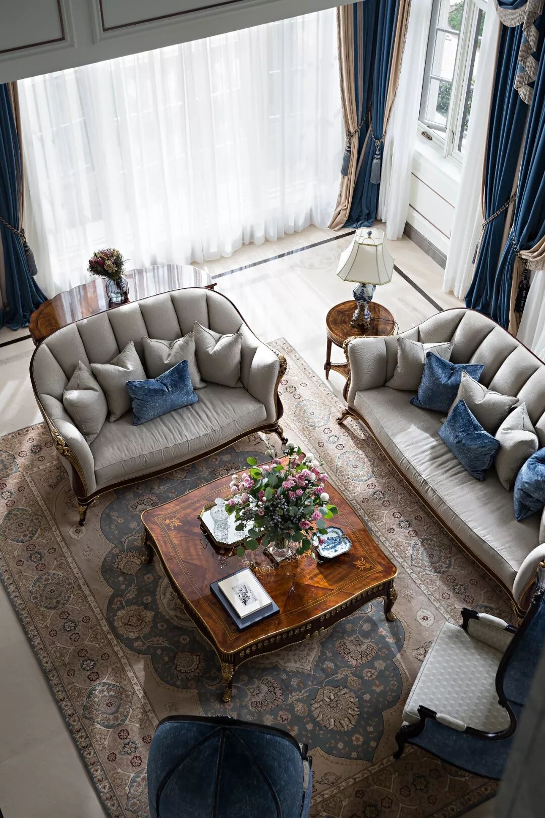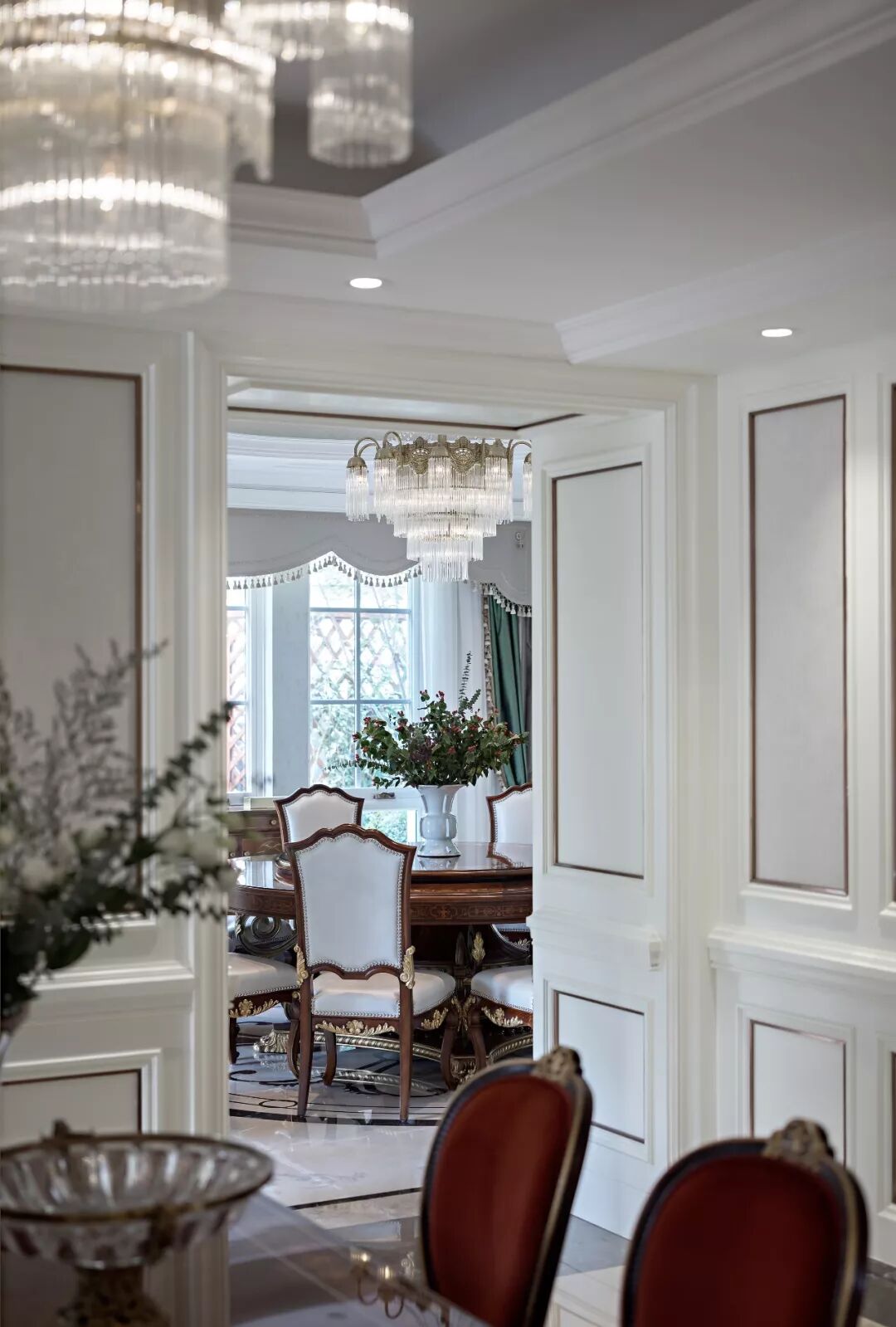 步入高挑明亮的客厅,如瀑倾泻而下的华丽窗帘,繁复精致的黄铜水晶吊灯和经典欧式墙壁镶边,空间中的优雅线条宛若水面波纹交错的柔性与动态,显出引人驻足的奢华布局手法。而置身其中的典雅大气的家具,则更凸显空间的新古典韵味。