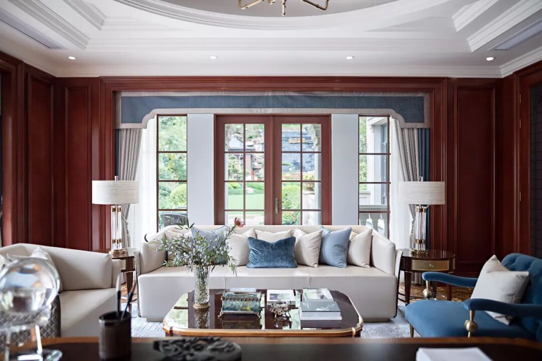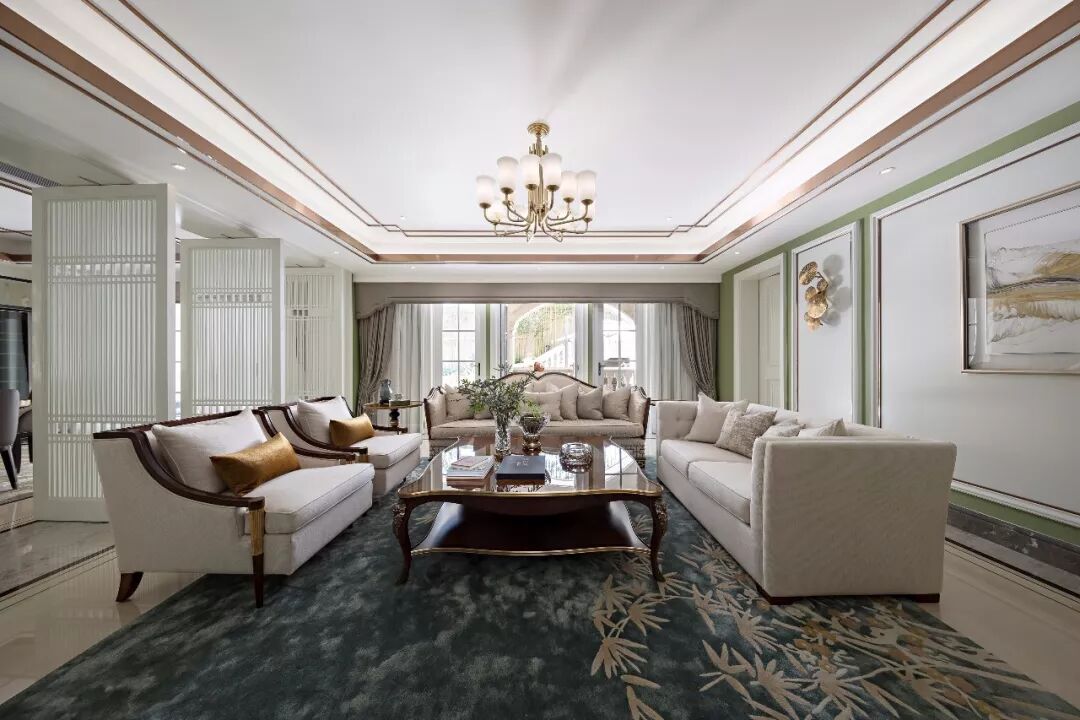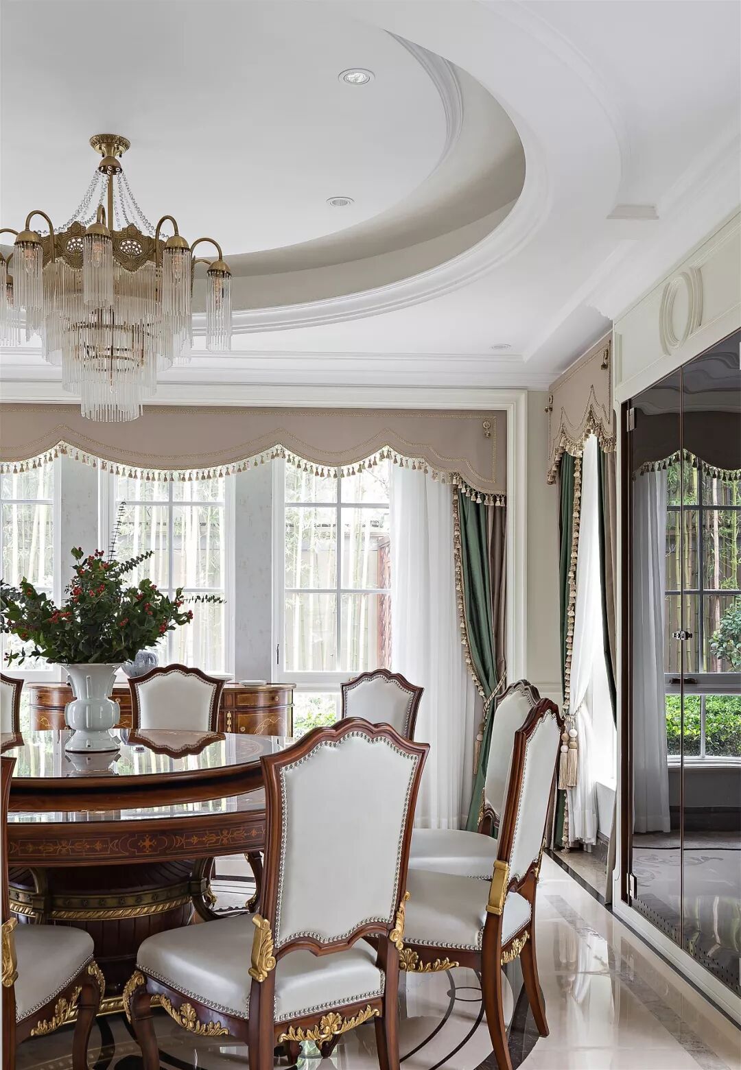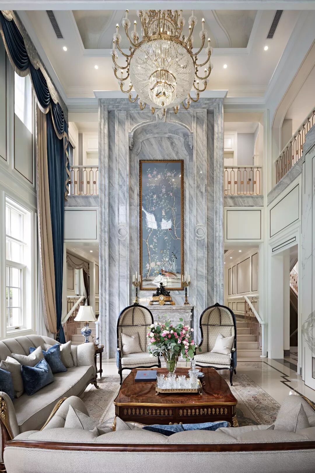 步入高挑明亮的客厅,如瀑倾泻而下的华丽窗帘,繁复精致的黄铜水晶吊灯和经典欧式墙壁镶边,空间中的优雅线条宛若水面波纹交错的柔性与动态,显出引人驻足的奢华布局手法。而置身其中的典雅大气的家具,则更凸显空间的新古典韵味。
