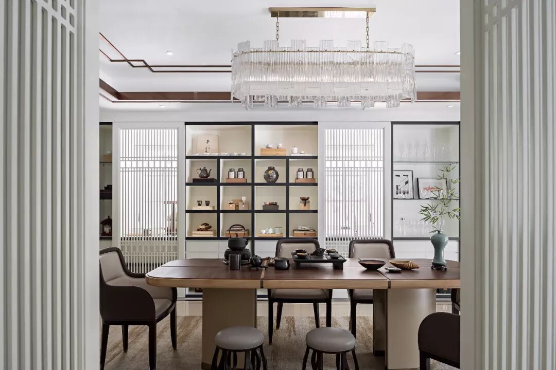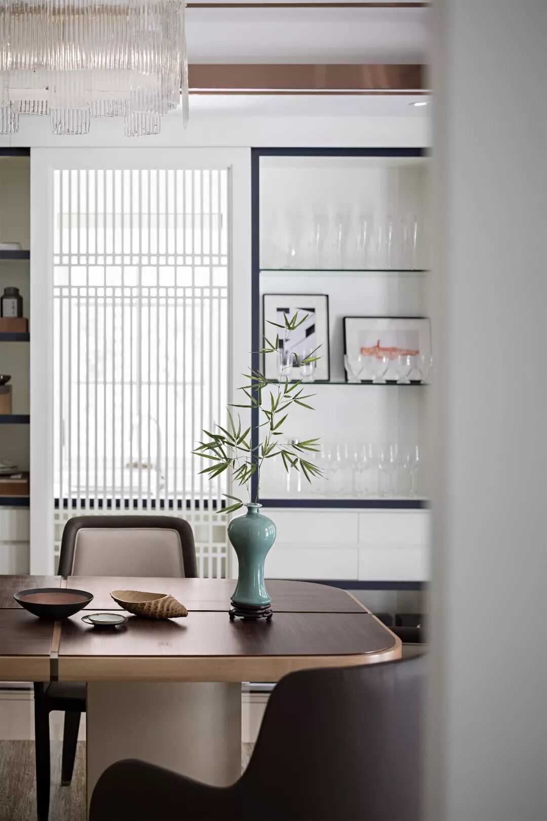 与此相连的是延续同样元素的中餐厅,光线充沛的落地窗前,一切遵循传统中式风格的圆形布置,营造了一家人一团和气的温馨用餐场景。