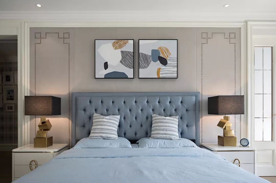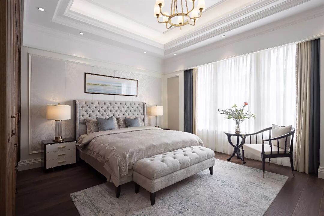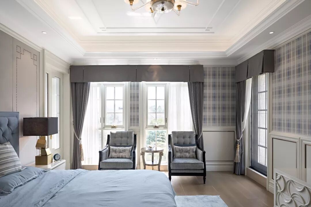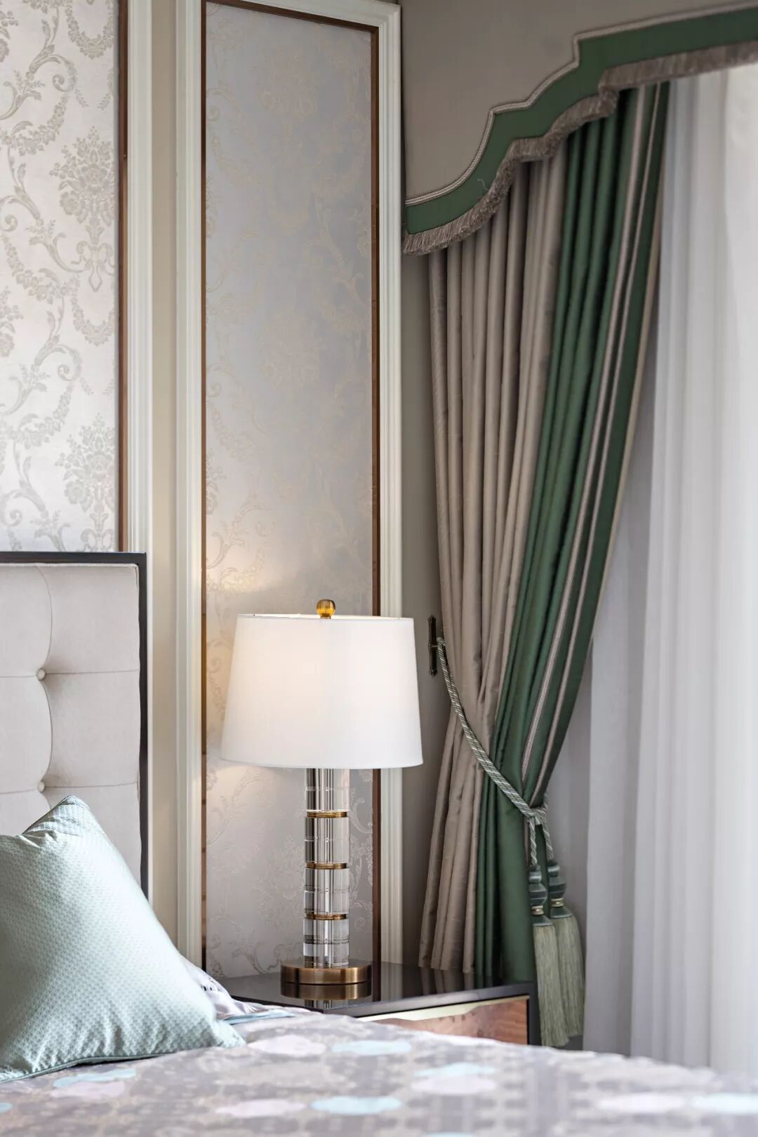 二层主卧是主人最私密的居家空间,色彩上运用清新的绿、富有质感的高级灰色加以少量白色柔和,营造出一派素雅高贵之韵,主人的亲和恬静之态皆汇聚于此。