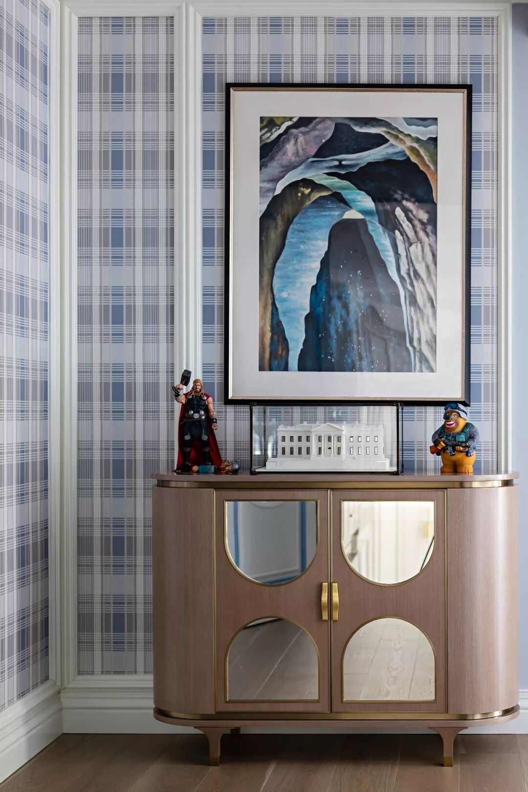 中庭天花上摩登形态的吊灯迎合着Art Deco风格的理石圆台,赋予了整个空间时尚轻奢的调性,也表达出迎客的礼仪感,侧边壁柜精心陈列着男主人所珍藏的艺术品。