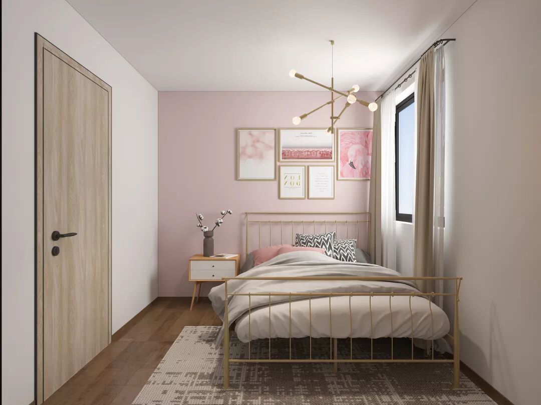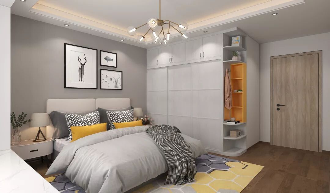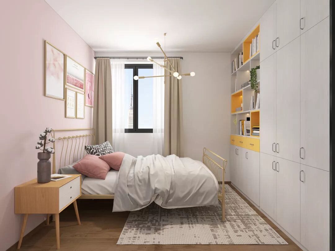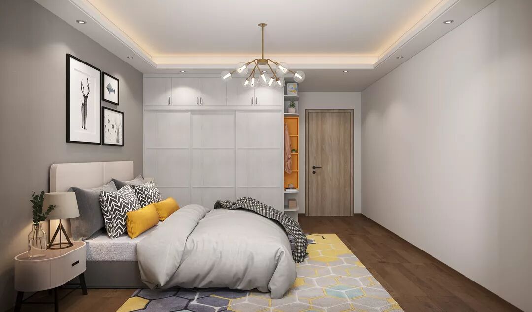 温暖的色调让人倍感温馨,主卧布局十分简约,衣柜的趟门设计不仅美观,推拉都非常便利。极富设计感的吊灯点缀了时尚感,暖暖的氛围让梦更香甜。