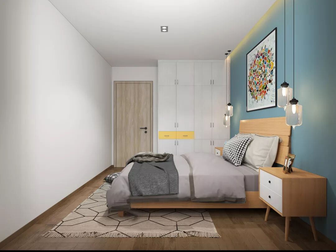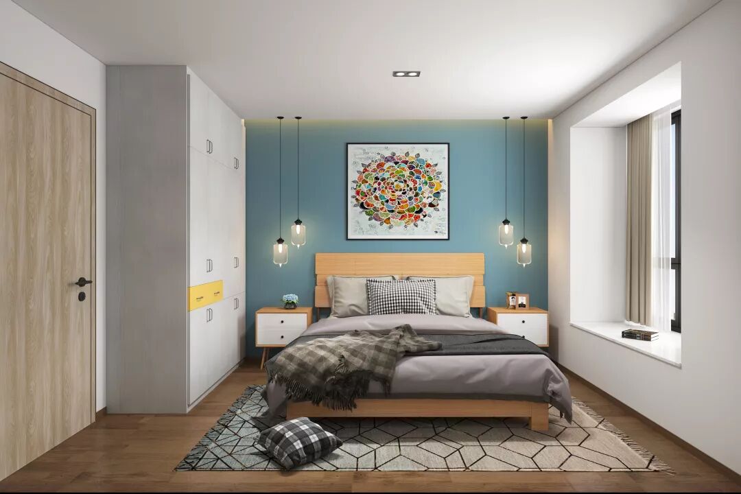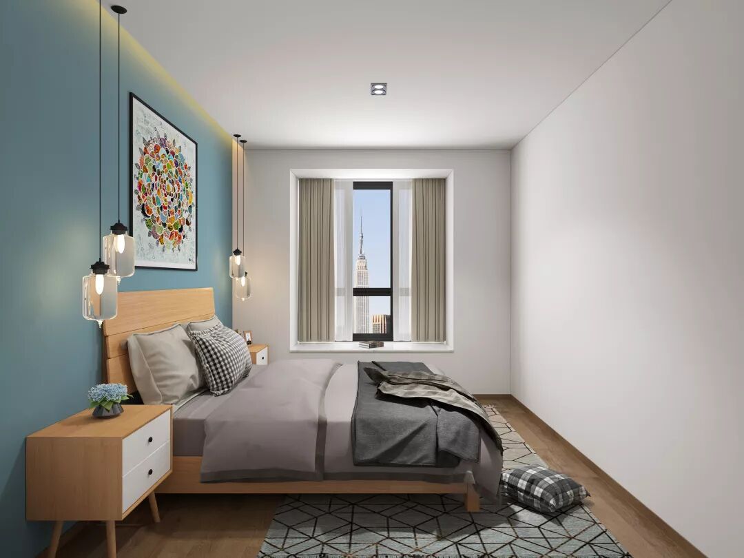 蓝色墙面让次卧显得复古有格调,带着北欧淡淡的优雅,在别致的吊灯渲染中将诗意和时尚融合在一起,使生活简约而充满温情。