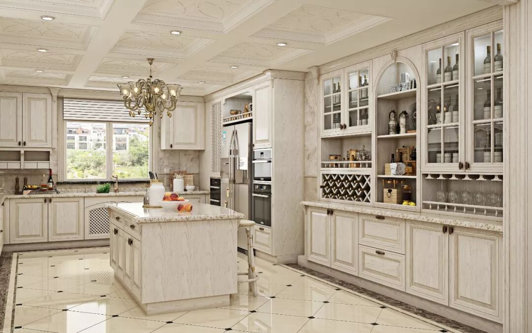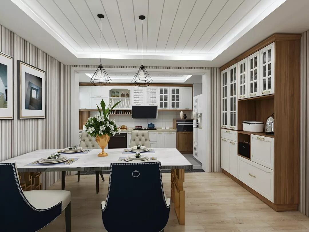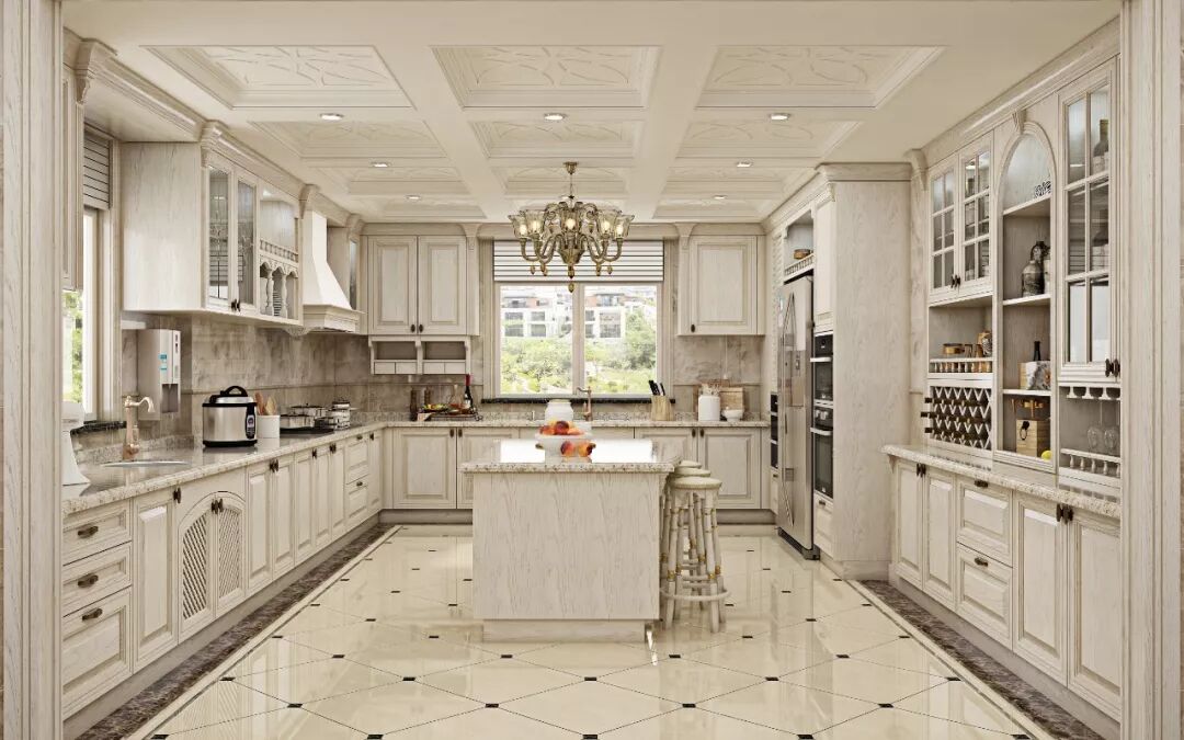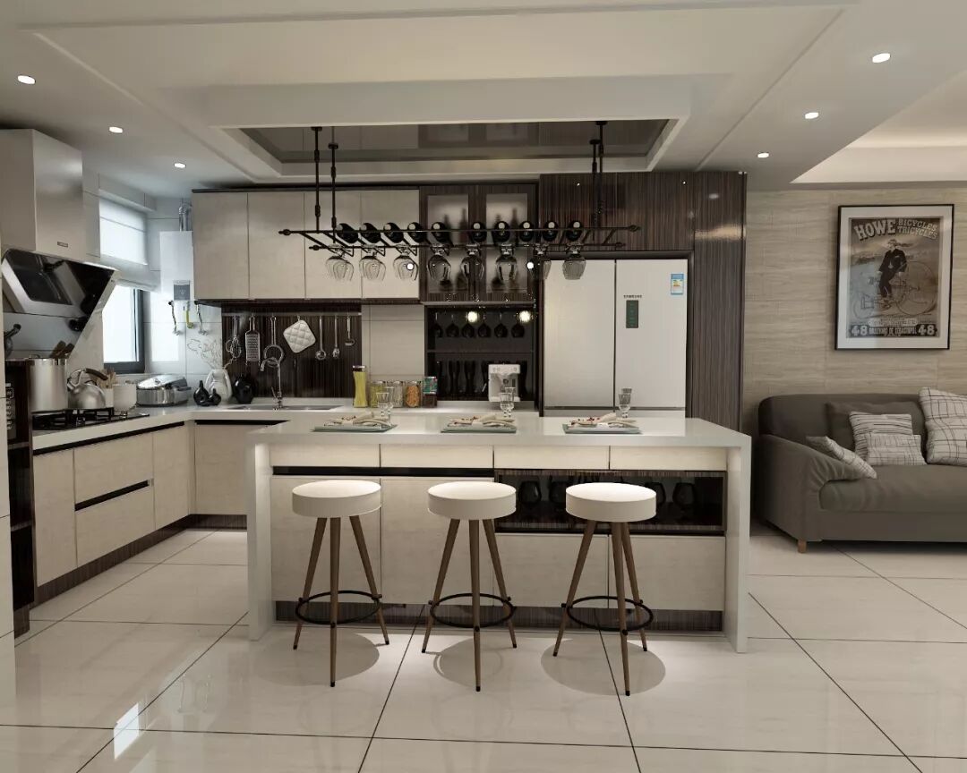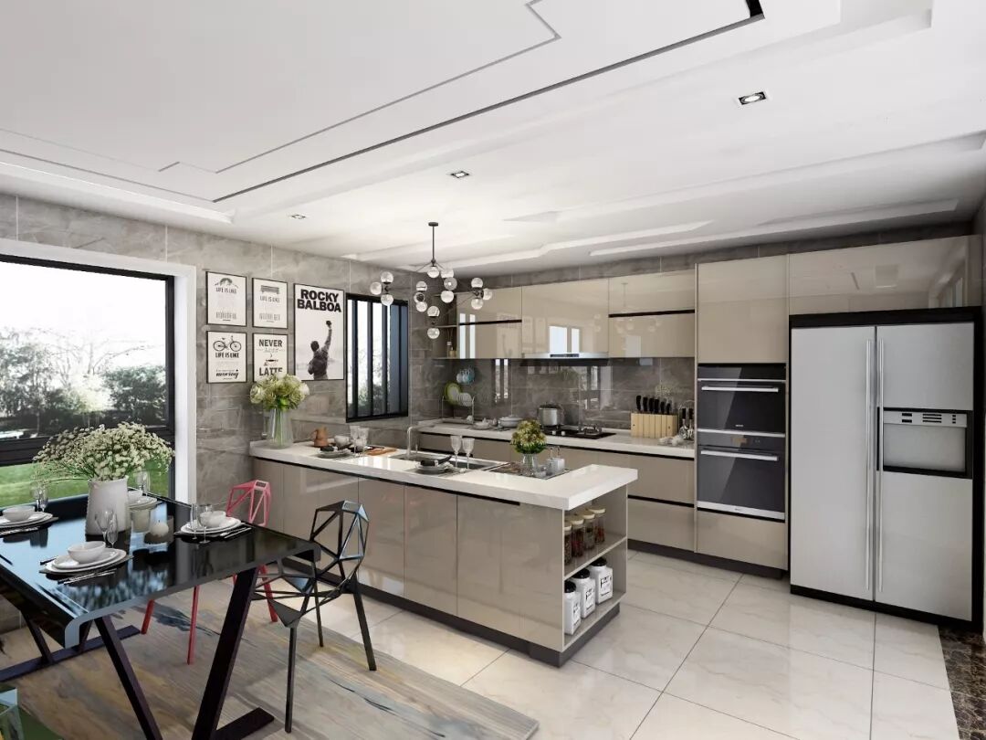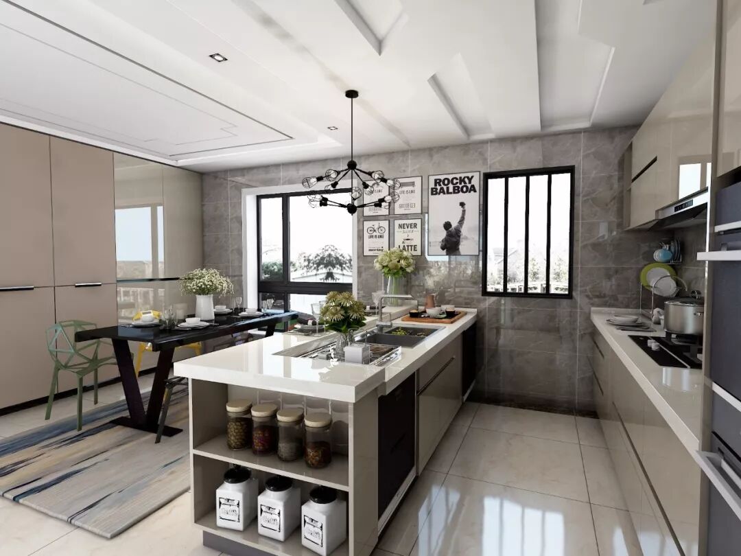 面积更大的厨房,可以直接采取大U型+中岛的整体设计。此时厨房不仅是烹饪空间,更是生活与休闲空间。
