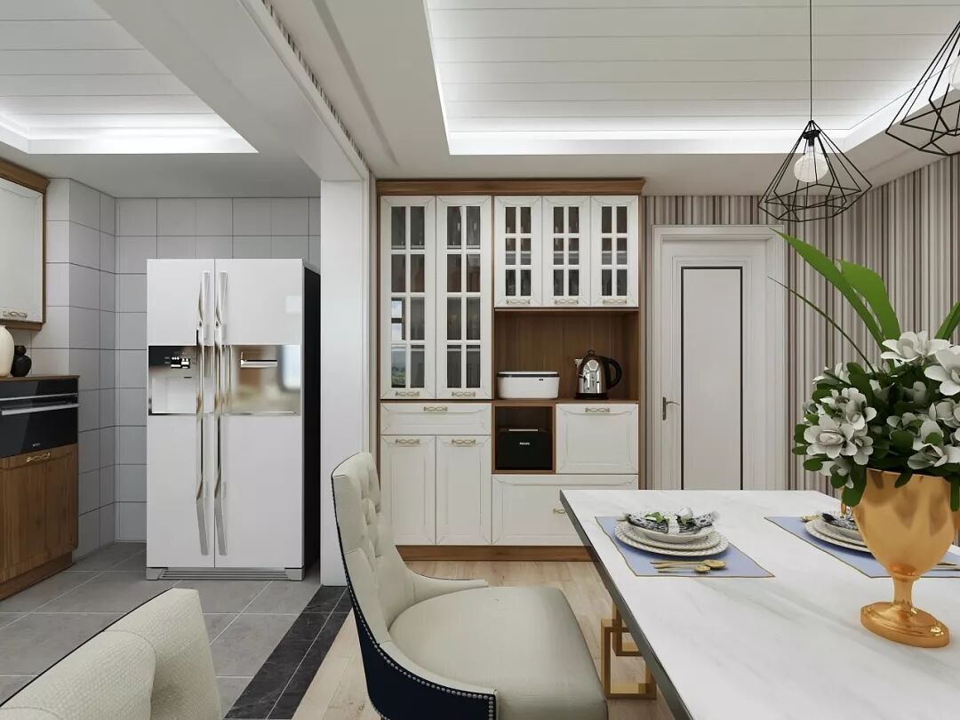 橱柜对出的空间可以留作餐厅使用,既减少了传菜的距离,还让餐厨空间更具有一体感。