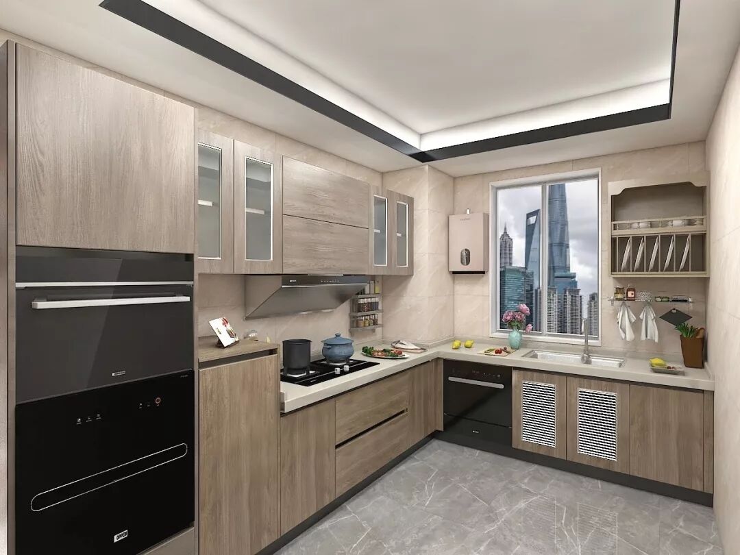 空间不算太逼仄的小户型可以考虑整体功能更丰富的L型橱柜,嵌入式厨电的设计不仅能最大程度地节省空间,而且整体还非常美观。