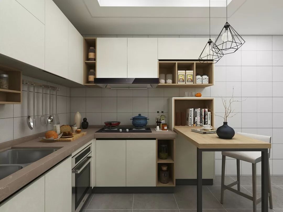 中户型厨房还可以在U型橱柜的基础上,设计一个功能性吧台。吧台可以作为隔断,将厨房打造成更独立的空间。