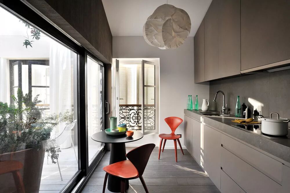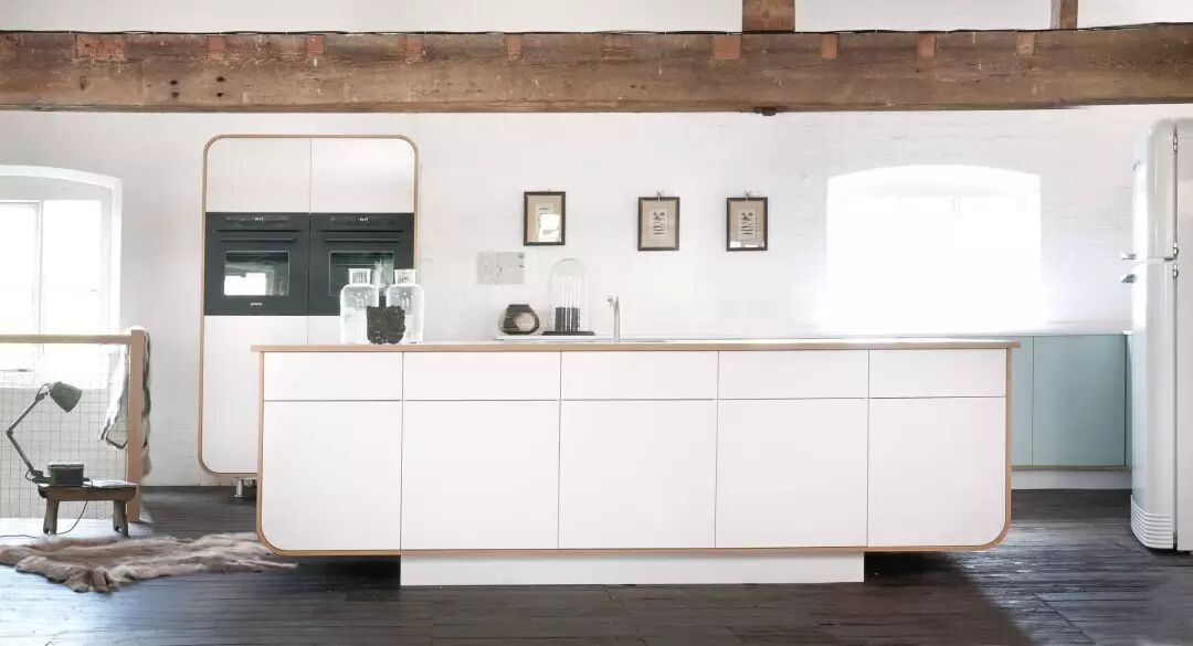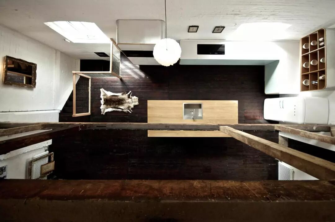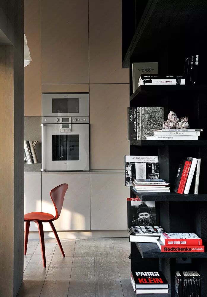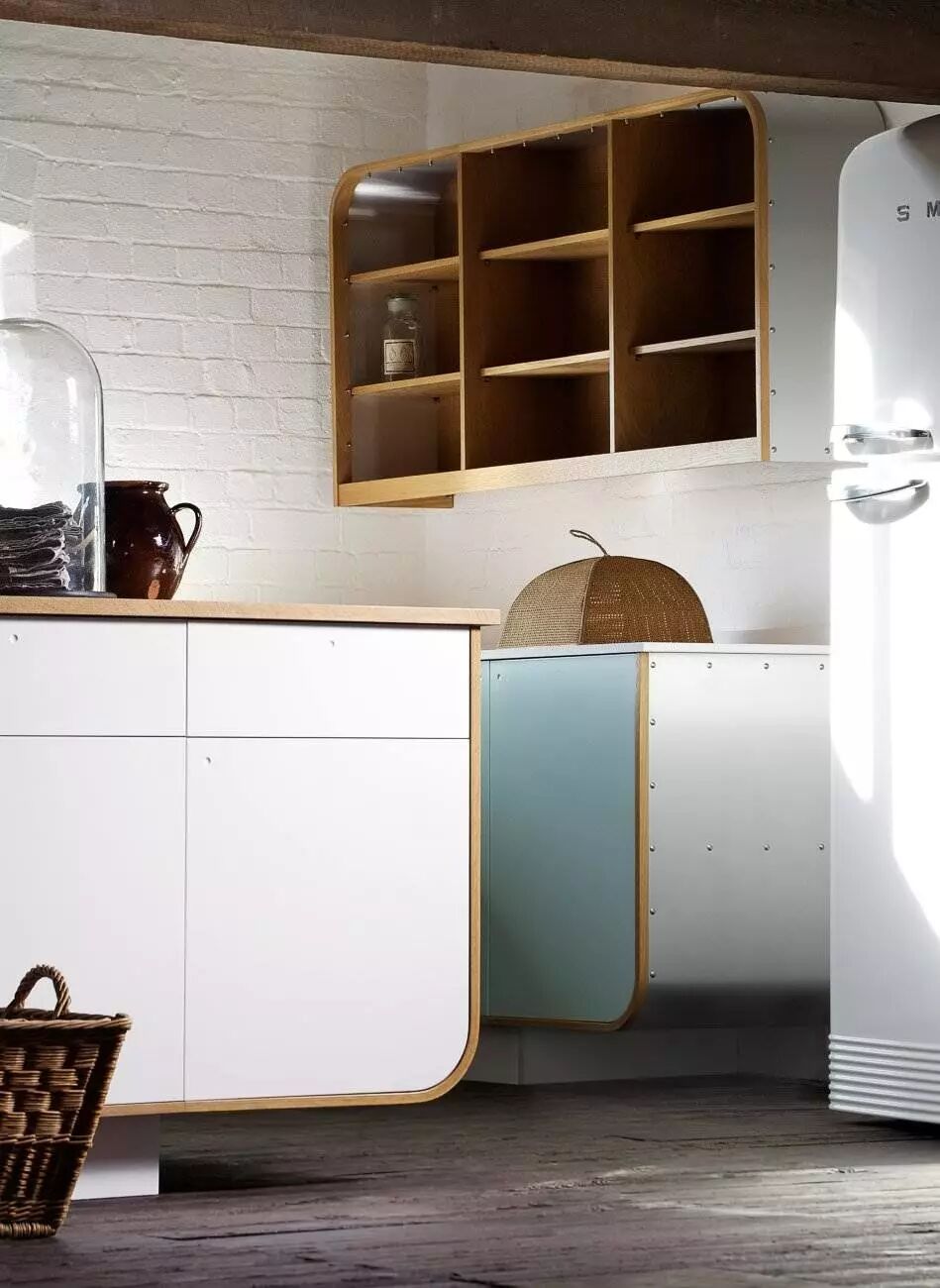 冰箱和烤箱成为橱柜的一部分,木质餐桌椅子在橱柜上方的木搁板上得到呼应。