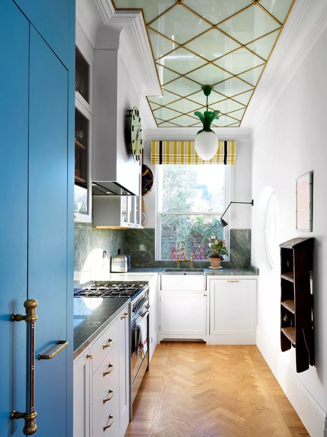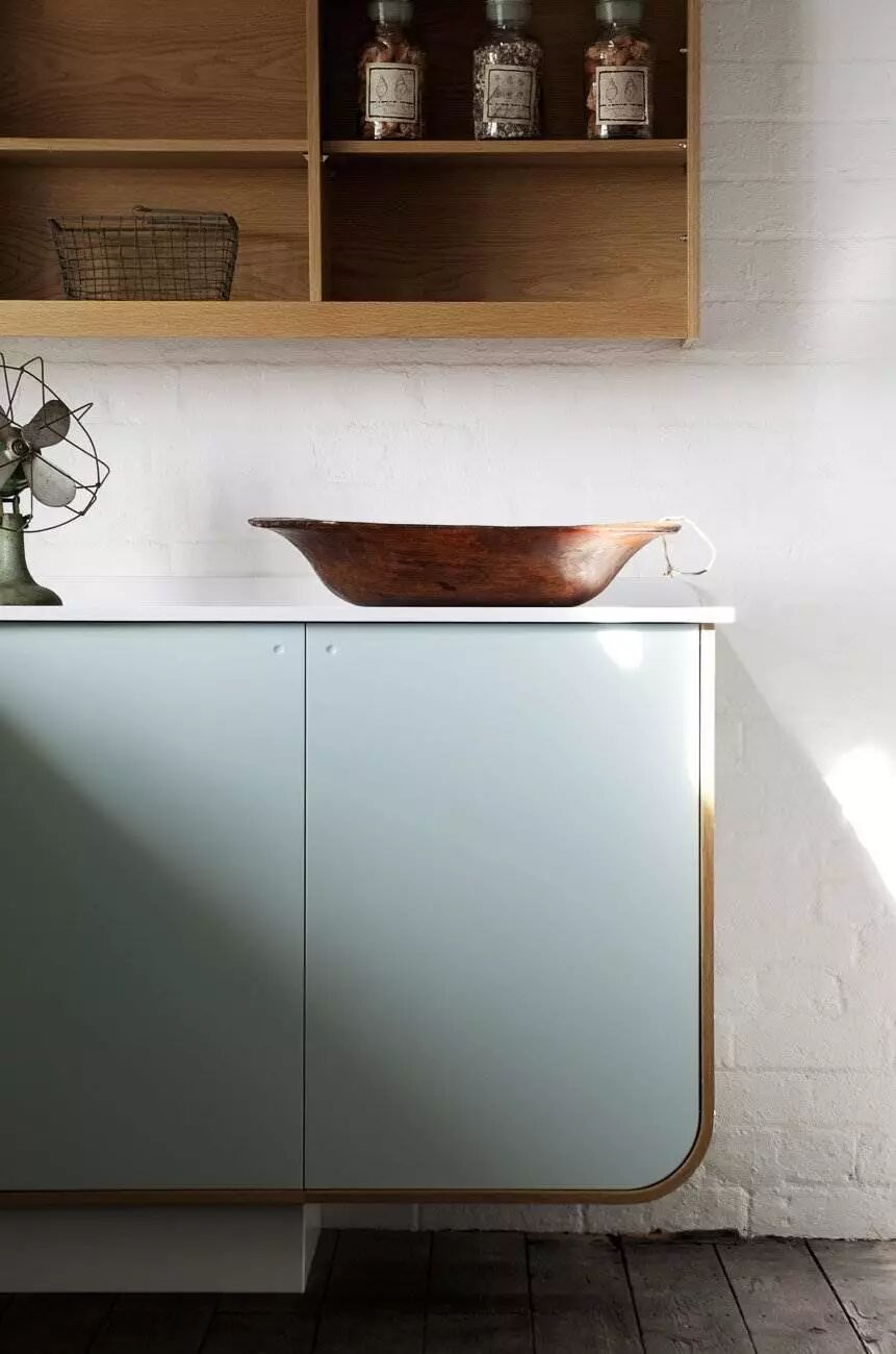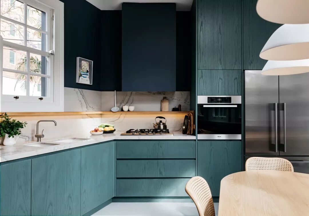 橱柜保留了原始木材的纹路,被打磨后涂上美妙的蓝绿色。