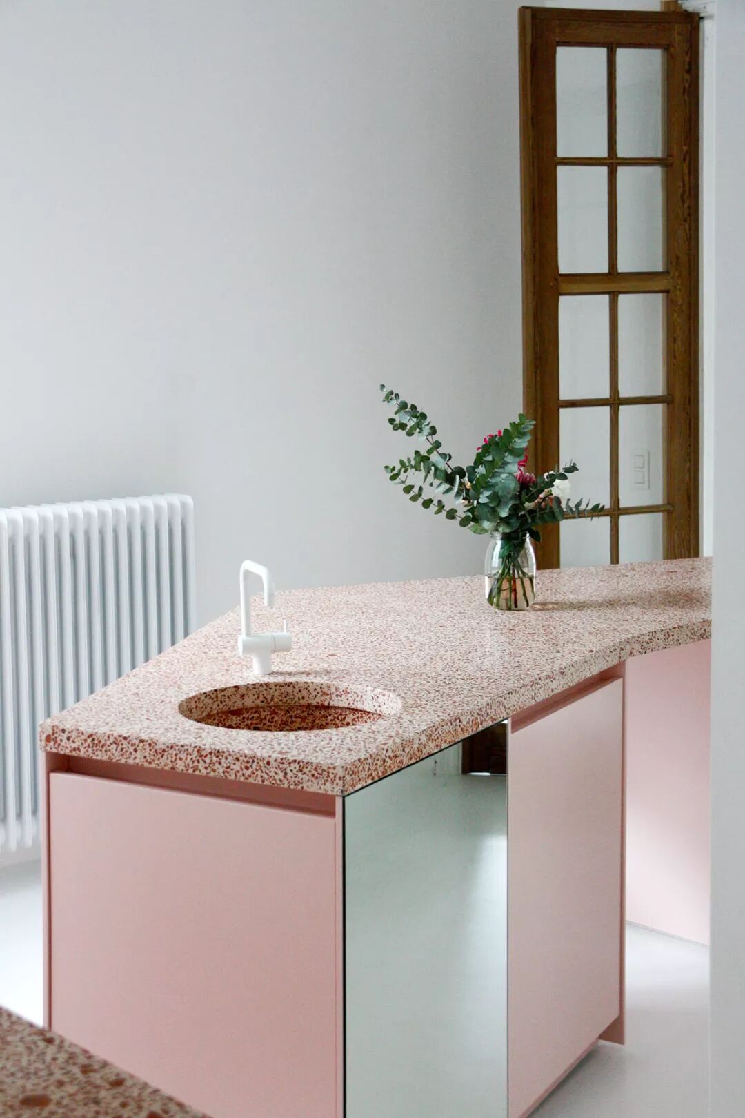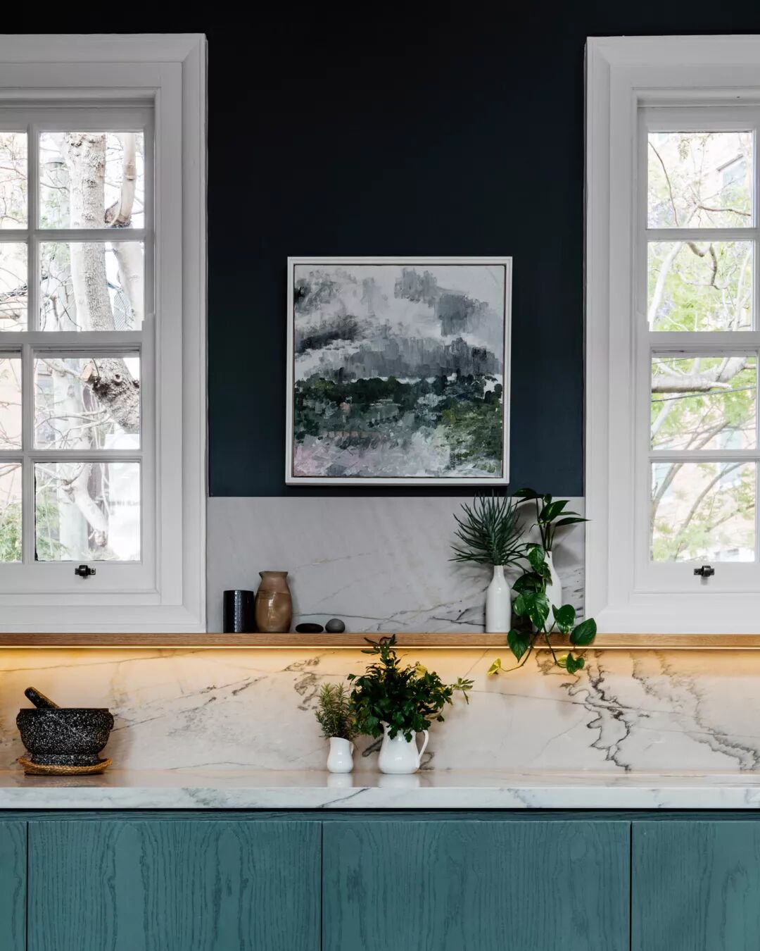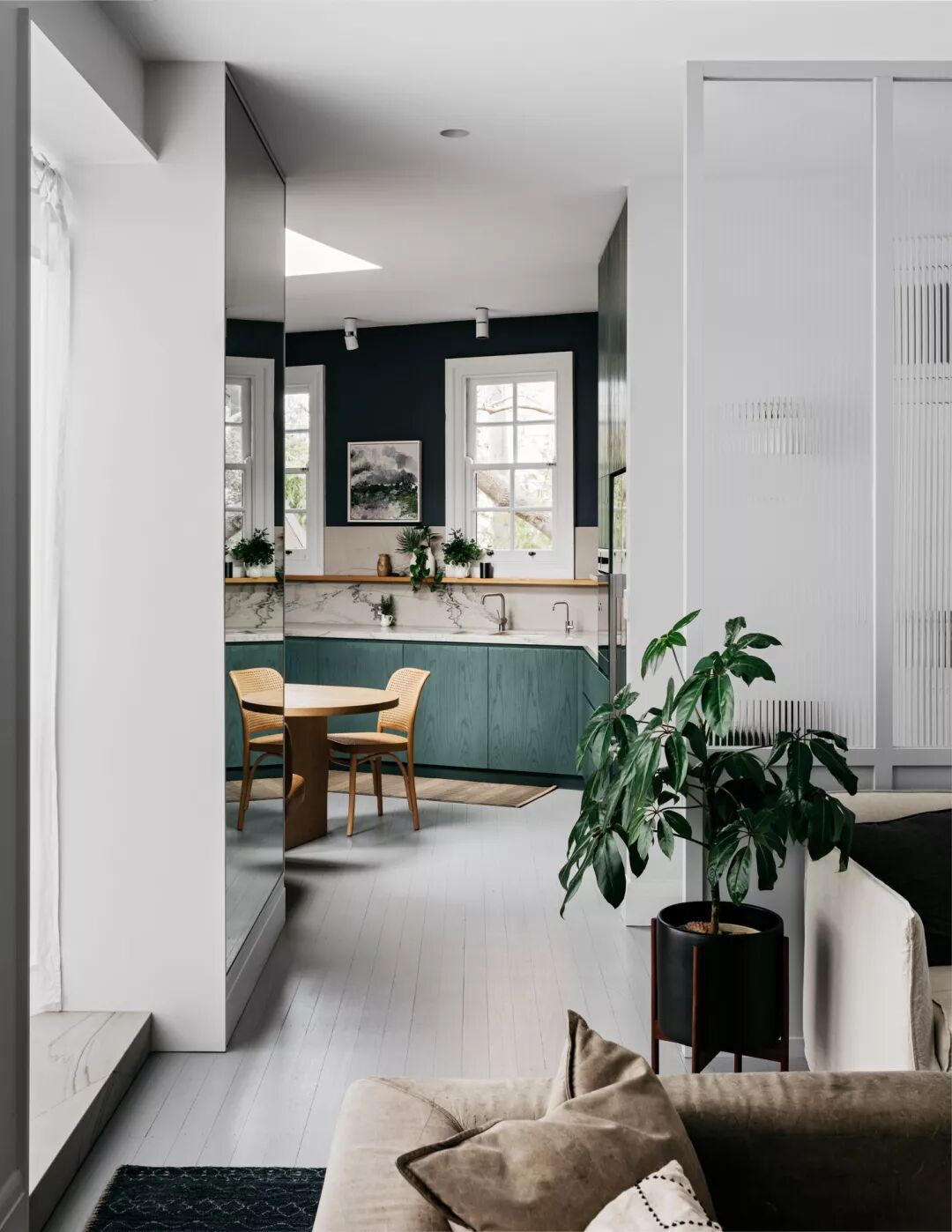 橱柜保留了原始木材的纹路,被打磨后涂上美妙的蓝绿色。