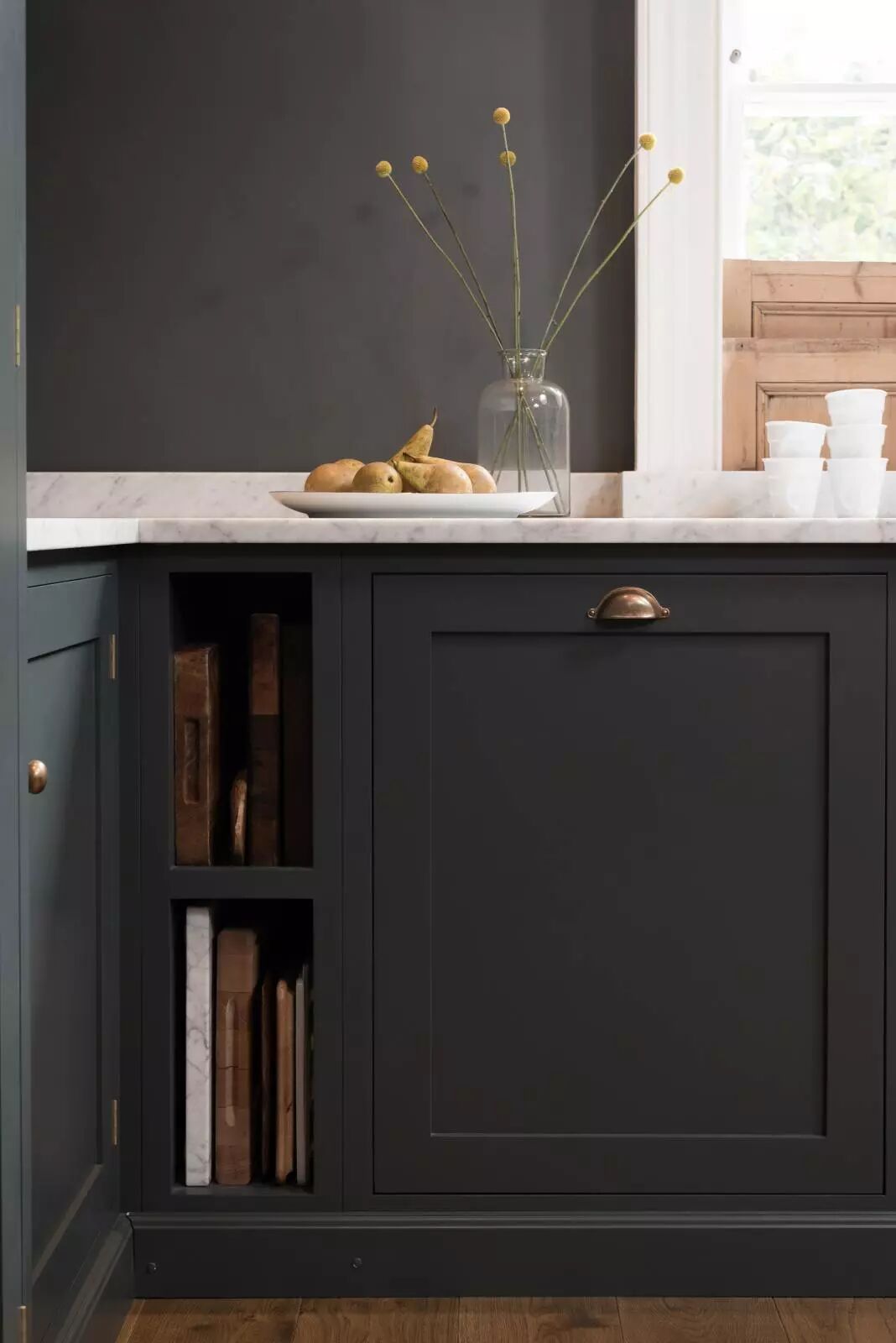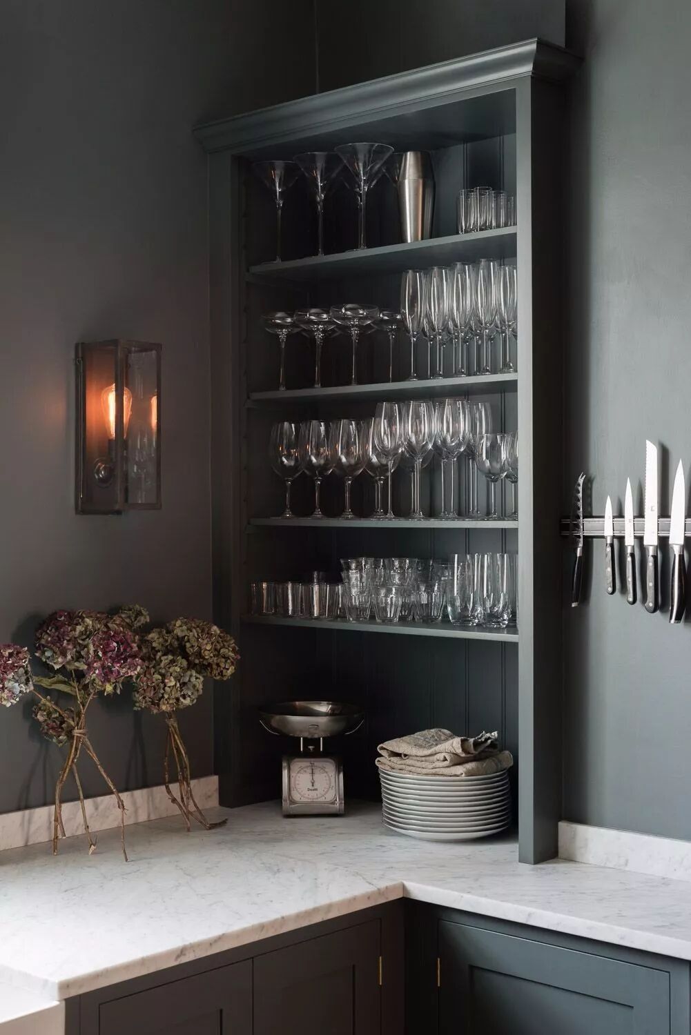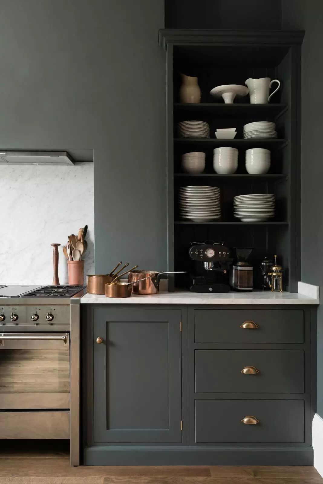 一个墨绿色的厨房是经典的,热情的,温暖的,舒适的,也是奢华的——这是我们从客人那总结来的评语,特别是当我们在其中使用核桃木和皮革拉门时,无疑又为其增添了流行的因素。墨绿色在厨房中的应用大概永远不会停止。