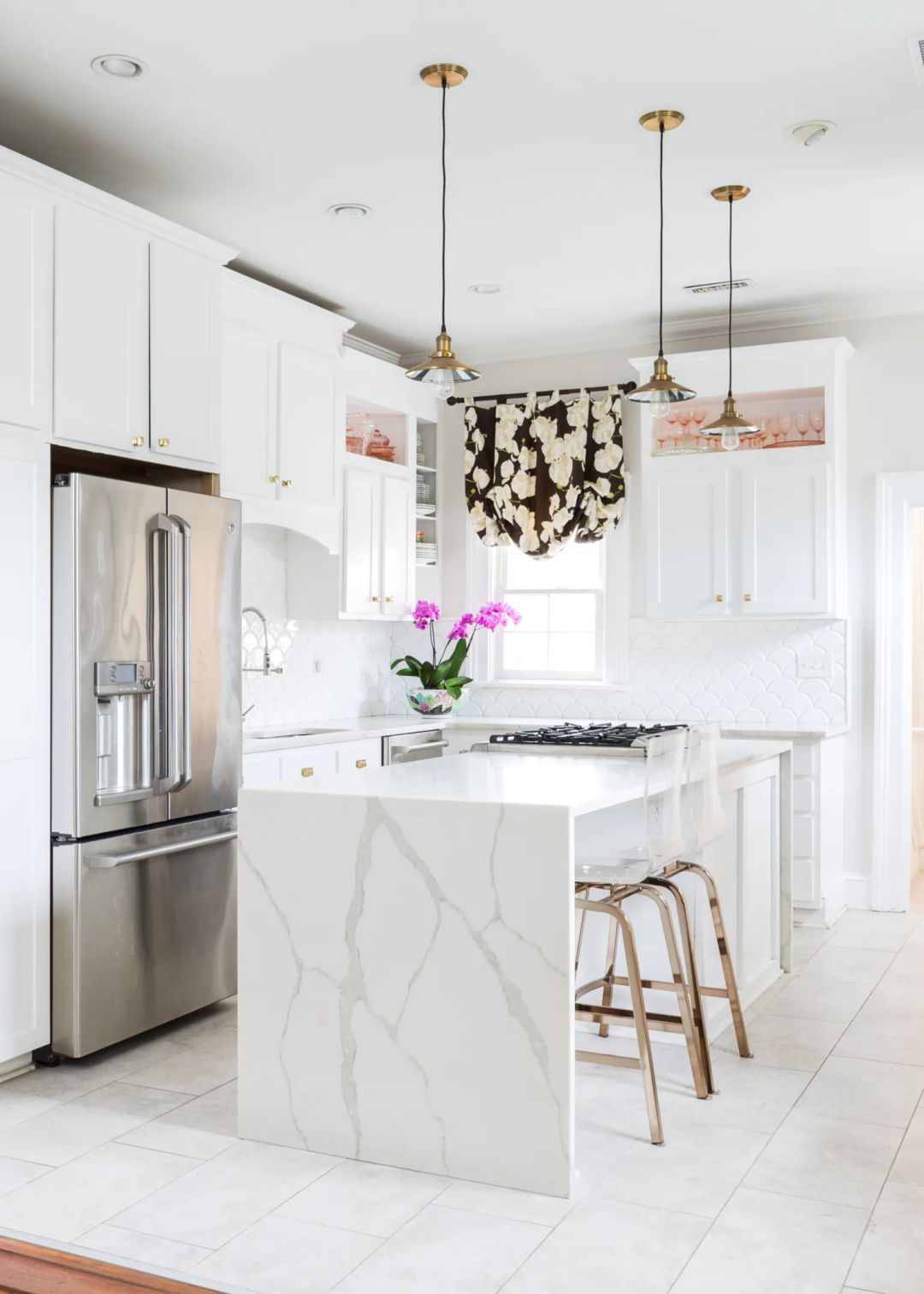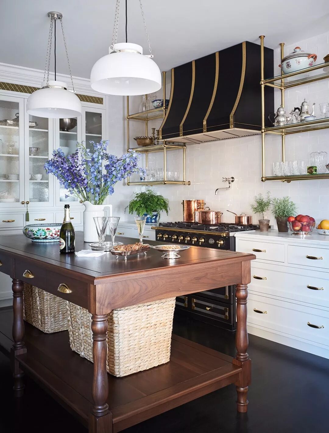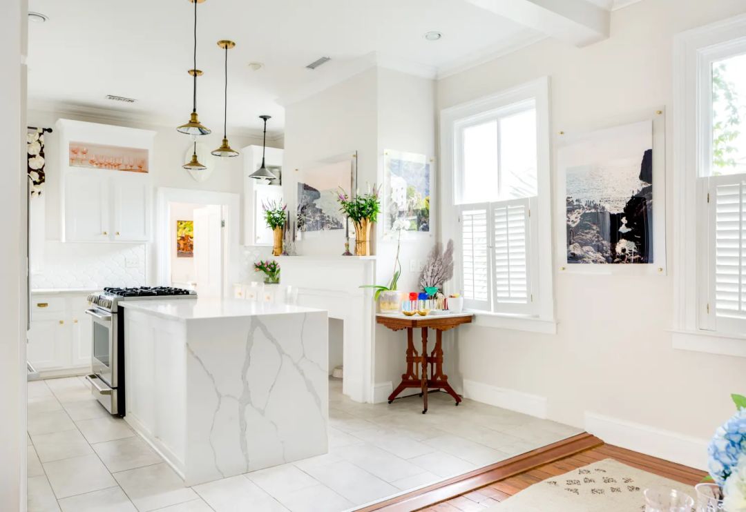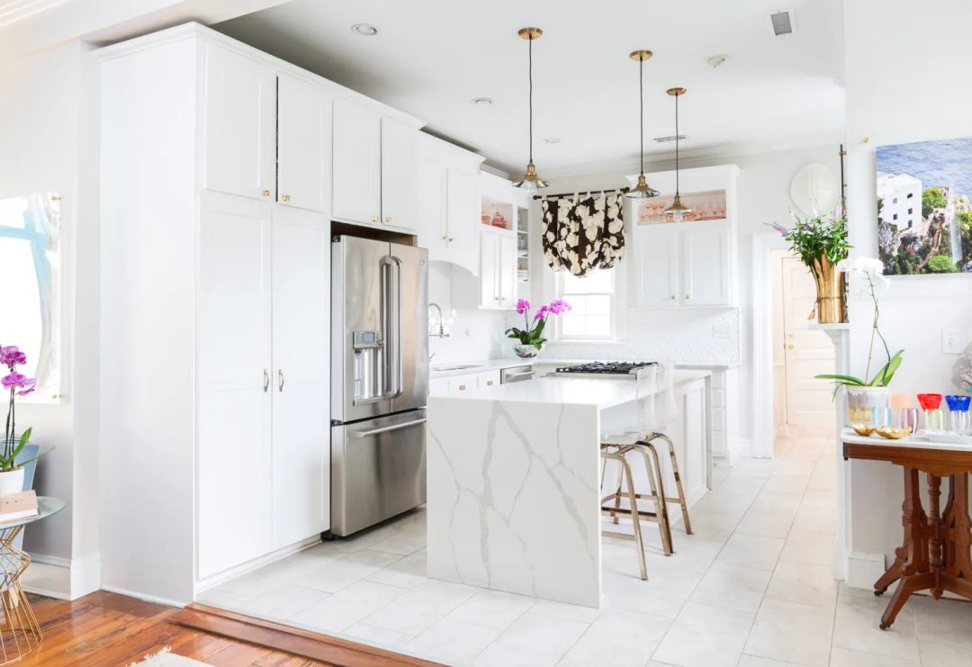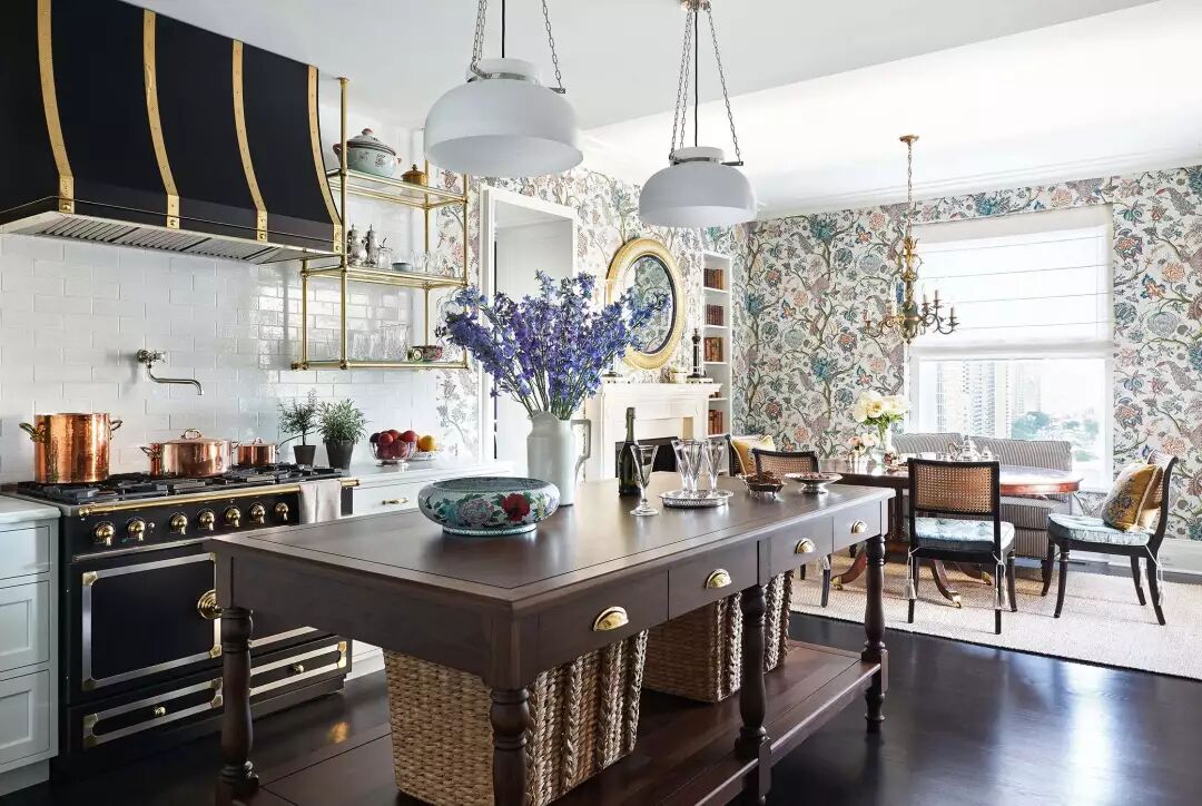 创造一个装扮得足以招待盖茨比的家,但仍感觉清新,不沉重。本着这样的意图,这间厨房拥有可观的华丽和现代时尚感。战前整体风格与精致的现代细节相遇,镀金装饰使空间看上去优雅奢华,白色使它保持清新,肉豆蔻色的复古厨房岛熨帖而温暖,紫色的插画增添了雅致的情调。