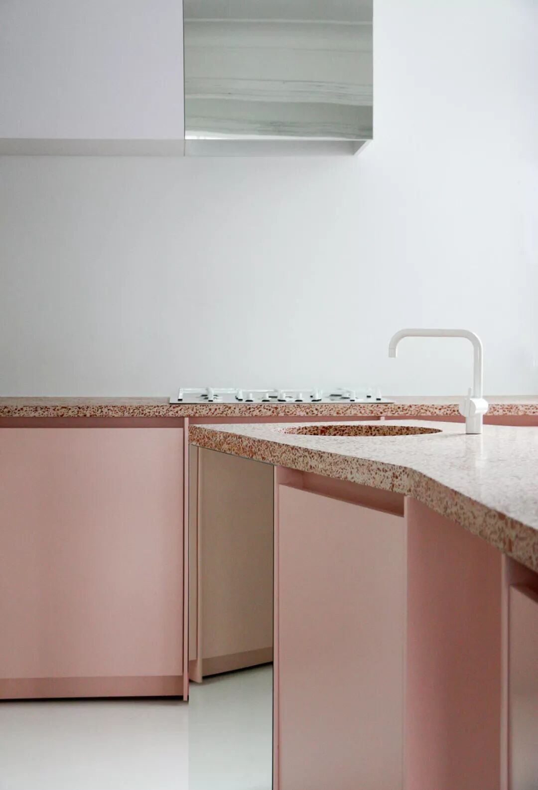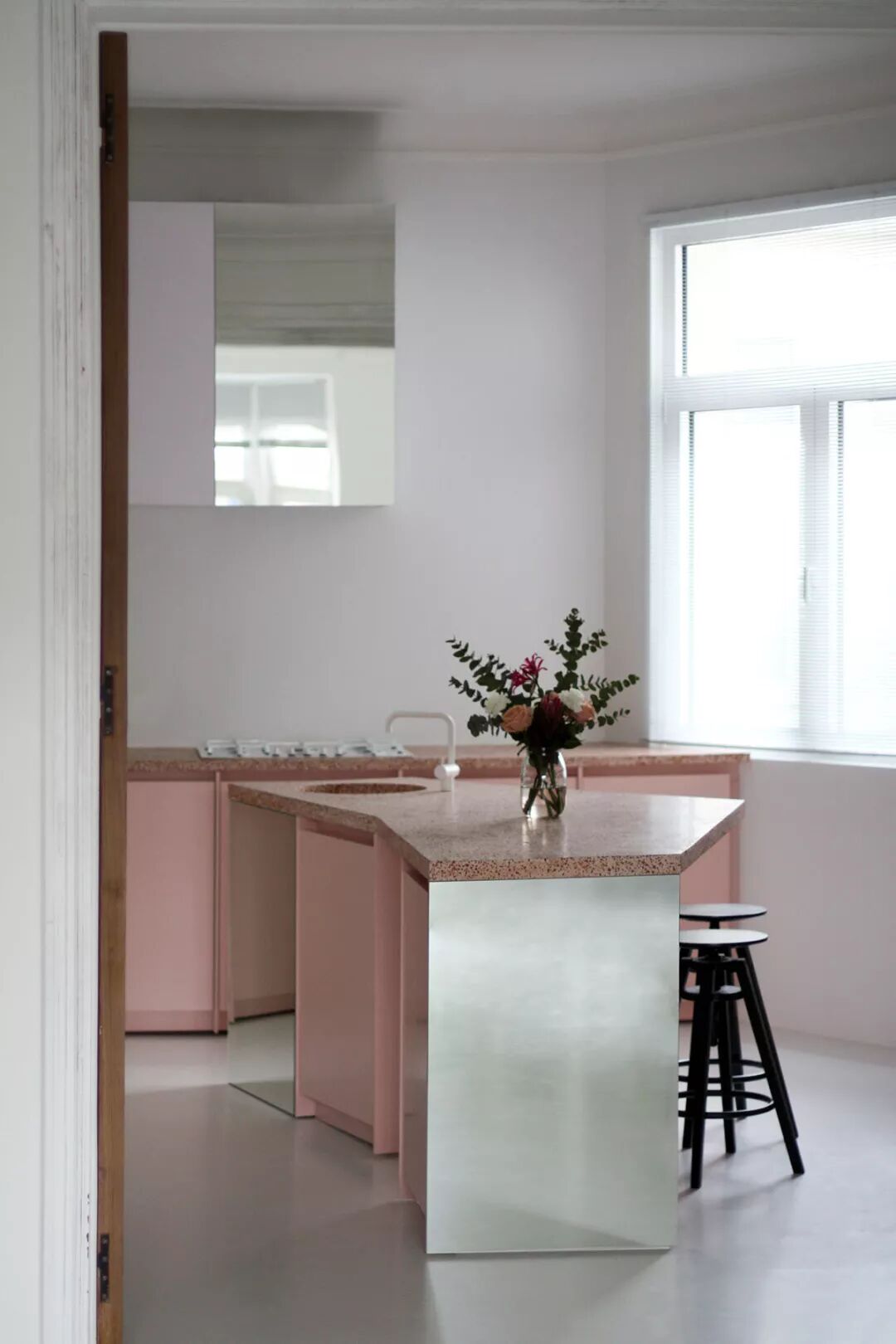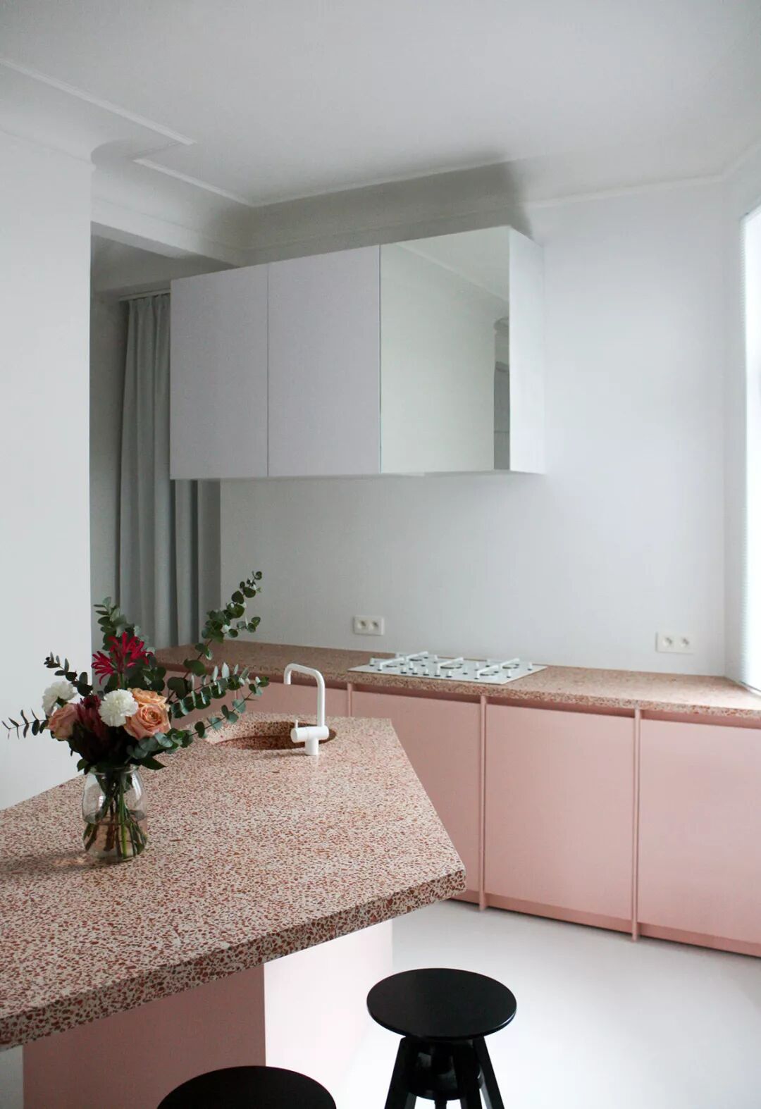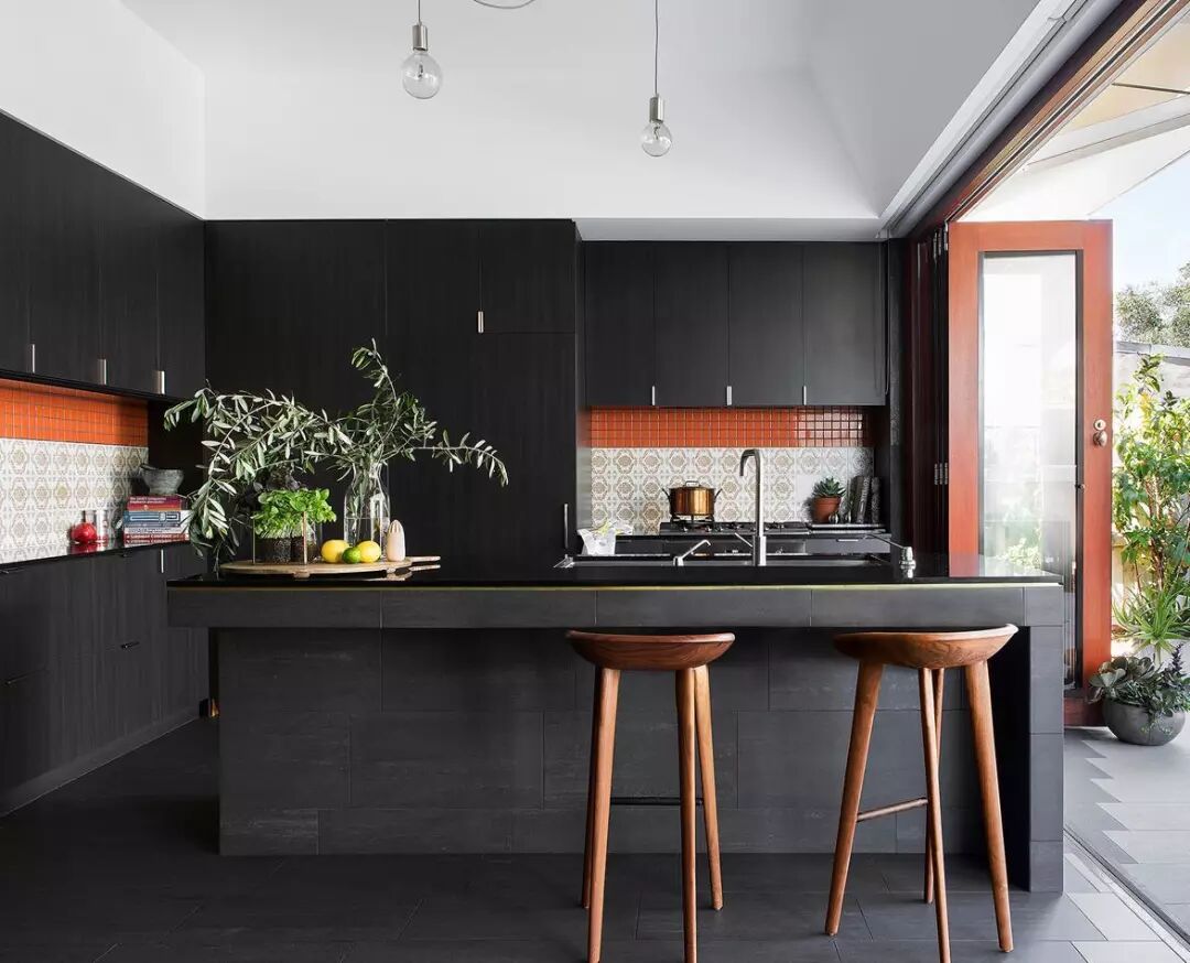 这间厨房的色调拥有20世纪70年代的复古特色。业主是一对年轻夫妻,他们想要创造一个封闭且连接花园的空间,这样两个孩子就可以在他们的密切注视下玩耍。4x6m空间的整个宽度上都使用了深色调,可确保厨房淡入背景,让花园的绿色成为焦点,营造出一种后院凉亭的感觉。南瓜色的背景瓷砖直观地讲述了房屋历史的故事并照亮了房间。天花板被抬高并涂上了低光泽的白色,以拓展视觉空间。当瓷砖向外推进时,瓷砖从深色变为浅色,这样在夏天也不会感觉很热。