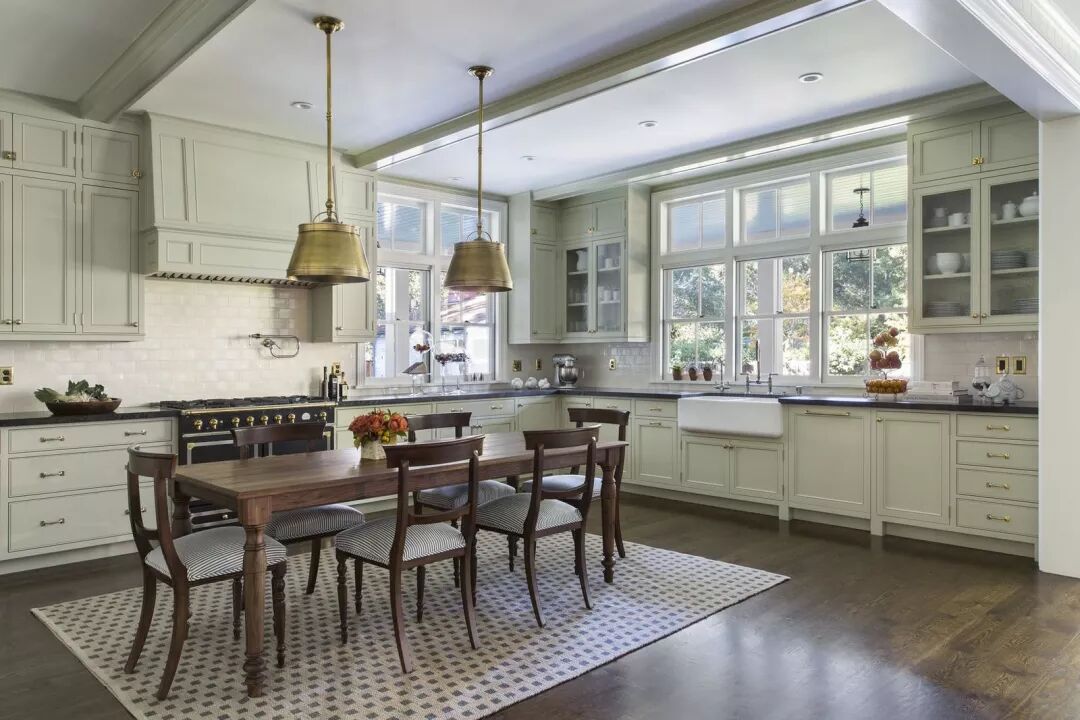 在这间新田纳西风格的农舍厨房中,灰绿色给出了一个柔美而清新的宣言。定制的橱柜拥有规整的浑然一体感,黑色的大理石台面在浅浅的底色下赋予空间微妙的力量感,暗柠檬色的黄铜吊灯悬挂在鹧鸪色木质餐桌上方,给这个用圆点地毯定义的空间带来一丝华丽与浪漫。