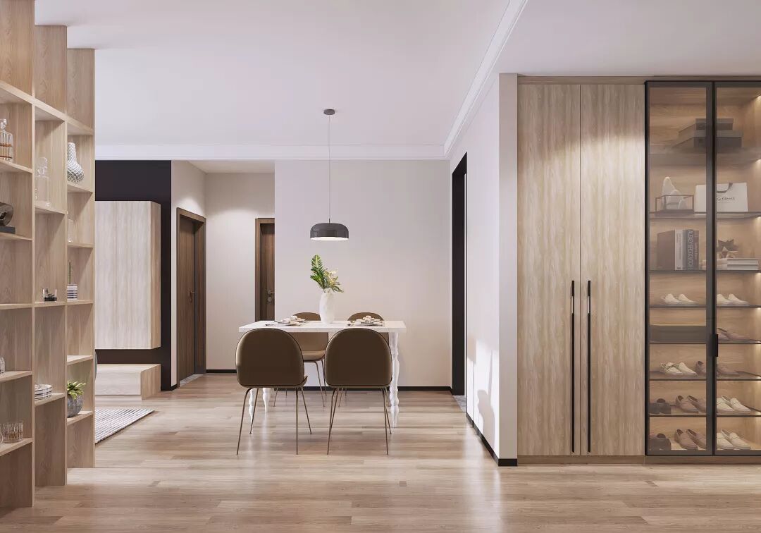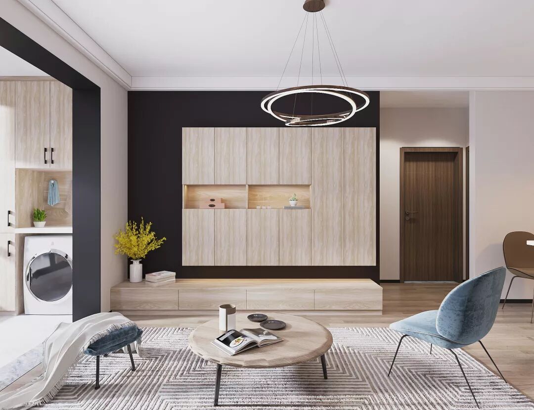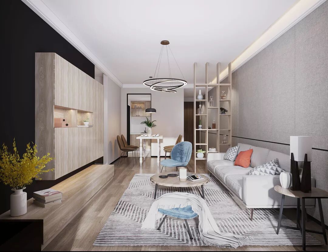 无电视柜设计在小居室里让空间利用率更加充足,为避免单调,设计上悬柜,增添储纳空间还非常美观。客厅与餐厅之间用搁架做过渡,简单自然,空间布局整洁且大气,让心灵达到远离尘世浮沉的境界。