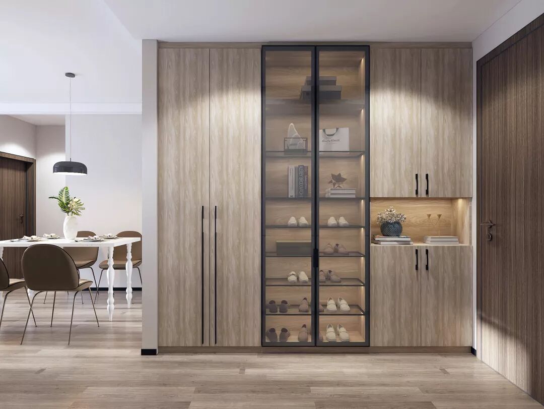 奶茶色书桌与冰川雪瑜花色让整个书房带上了丝丝禅意,可以让人更加轻松地在这个空间里学习、工作。书柜也采用多格分区的设计,中间用玻璃掩门与金属边框装饰,便于展示与常用书籍的拿取。小空间但是氛围足,设计不乏巧思。