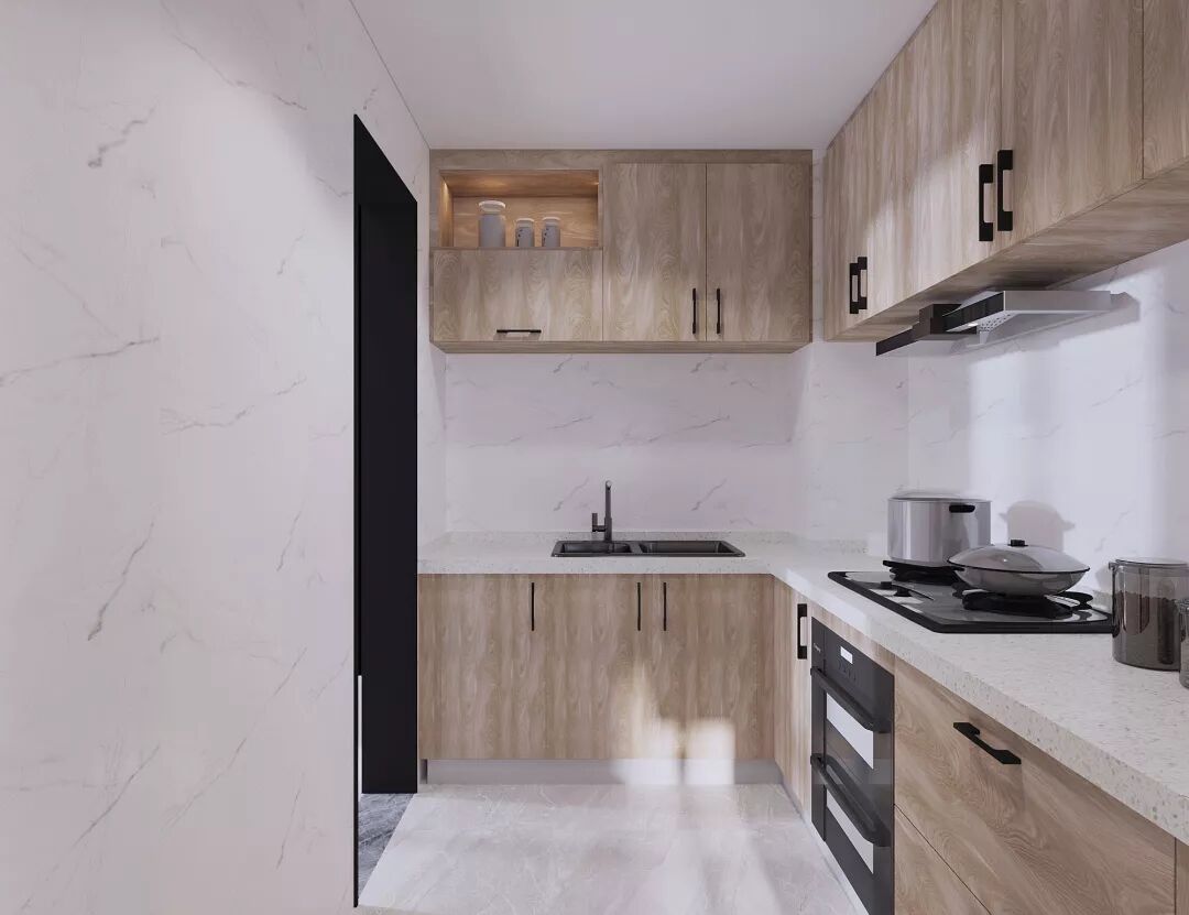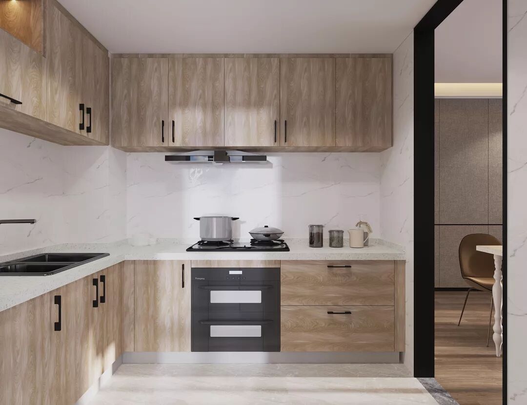 厨房的设计格调非常好,L型让空间0浪费。冰川雪瑜与大理石墙面碰撞出轻奢的火花;顶柜收纳和展示结合,藏起零零碎碎摆出常用品,拿取非常便利;干净的台面让烹饪更加愉悦。
