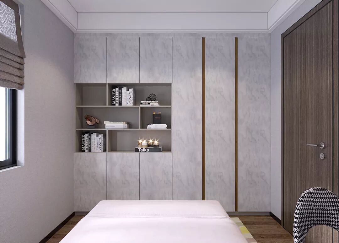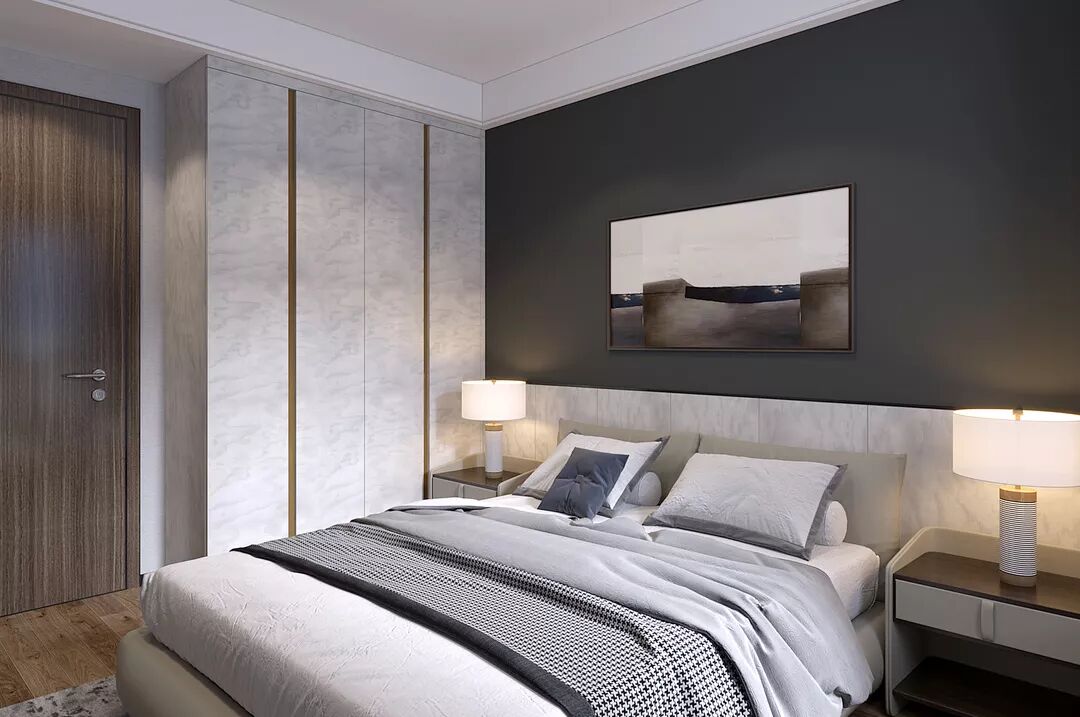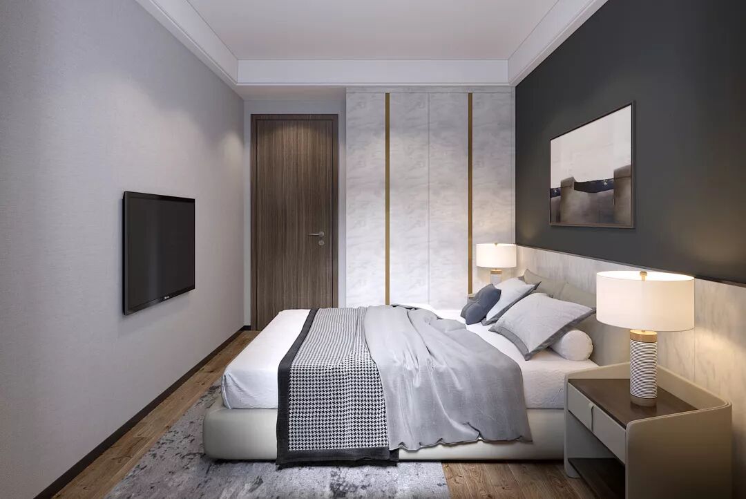 一柜到顶的衣柜与次卧空间的简约设计非常整一,灰黑色十分尊贵,与冷调的衣柜融合碰撞出生活的温度。