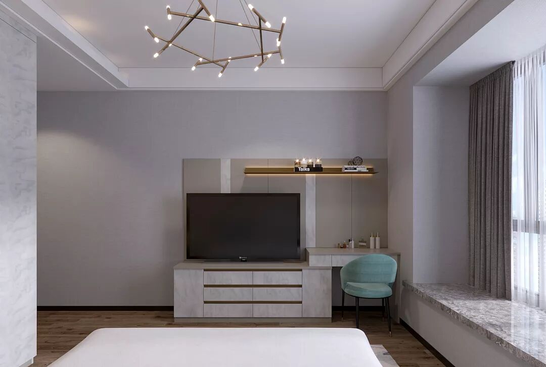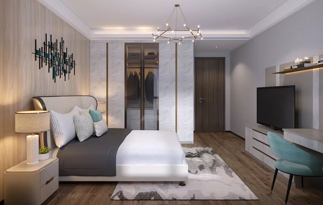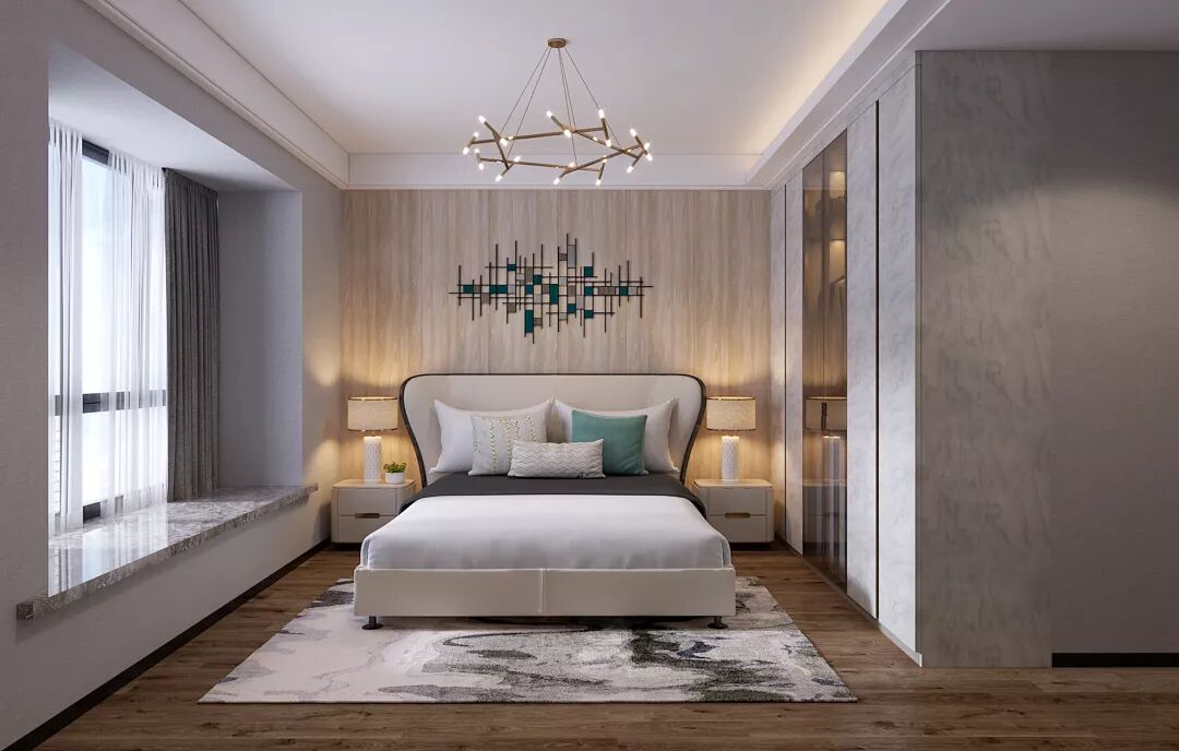 高贵的纹理与木色共同构筑出主卧这一方温情的空间。富有设计感的吊灯点缀在卧室里,非常时尚;封闭式衣柜中间以玻璃门加金属设计,内置LED等装饰,十分有质感。