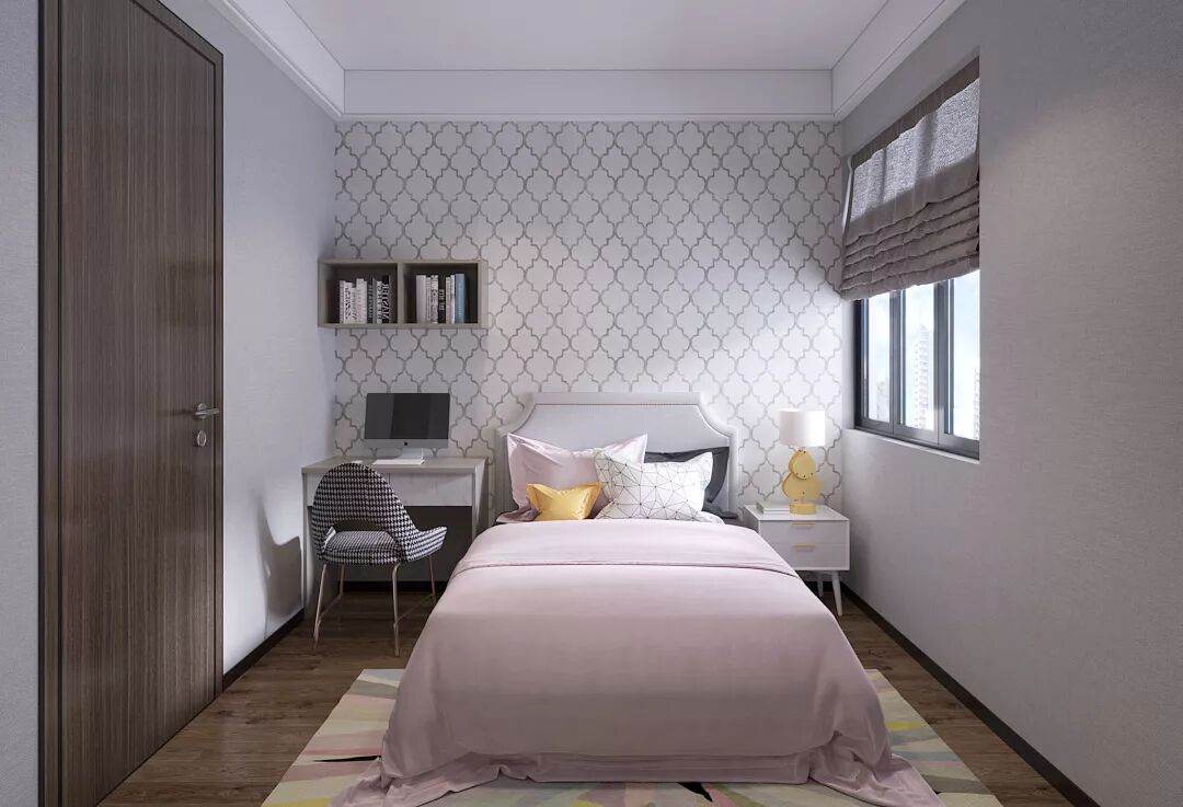 简约格纹的墙面软装让空间看上去非常整洁、活泼。巧妙利用空间,整墙的柜体给孩子充足的储纳和展示空间,学习柜依床而设,悬柜可以放置书籍,合理优化空间布局,让孩子有更多的活动空间。